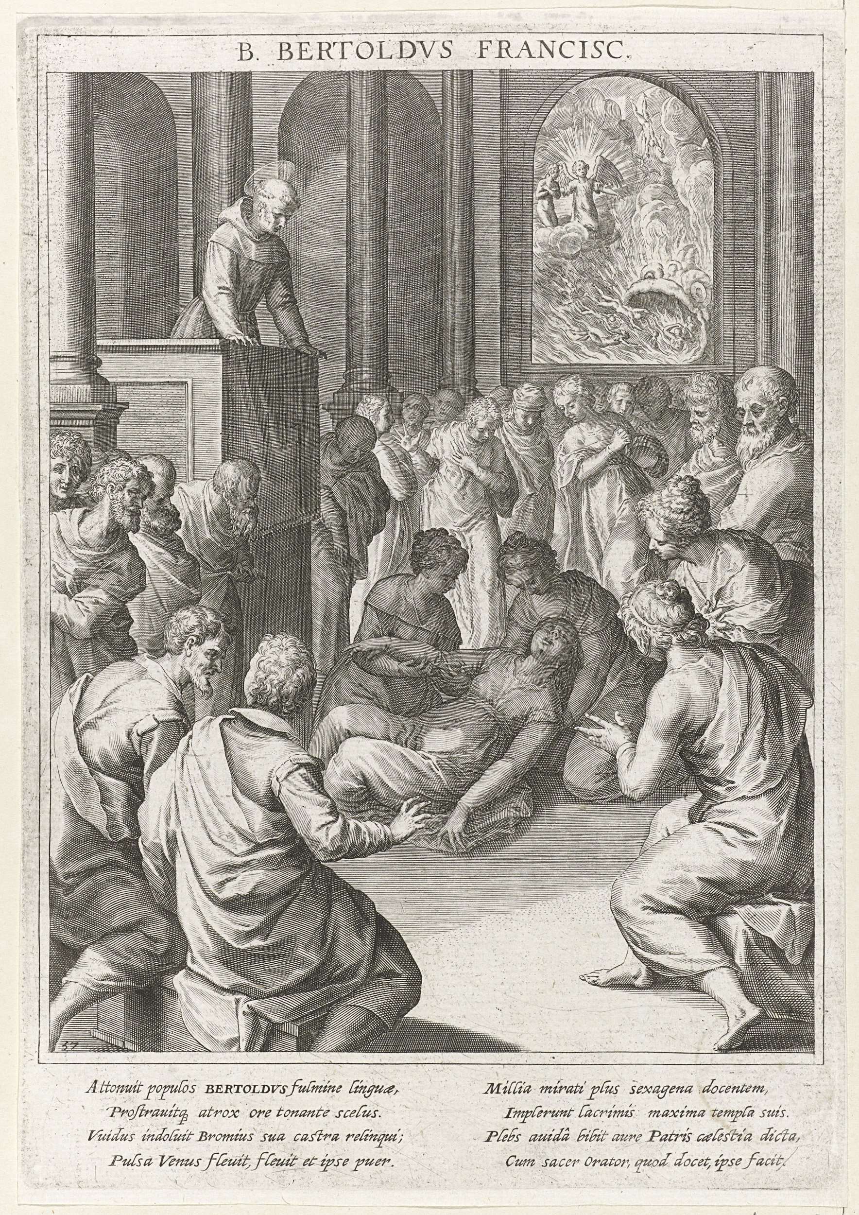 Heilige Bertholdus van Regensburg wekt met een preek een vrouw terug tot leven