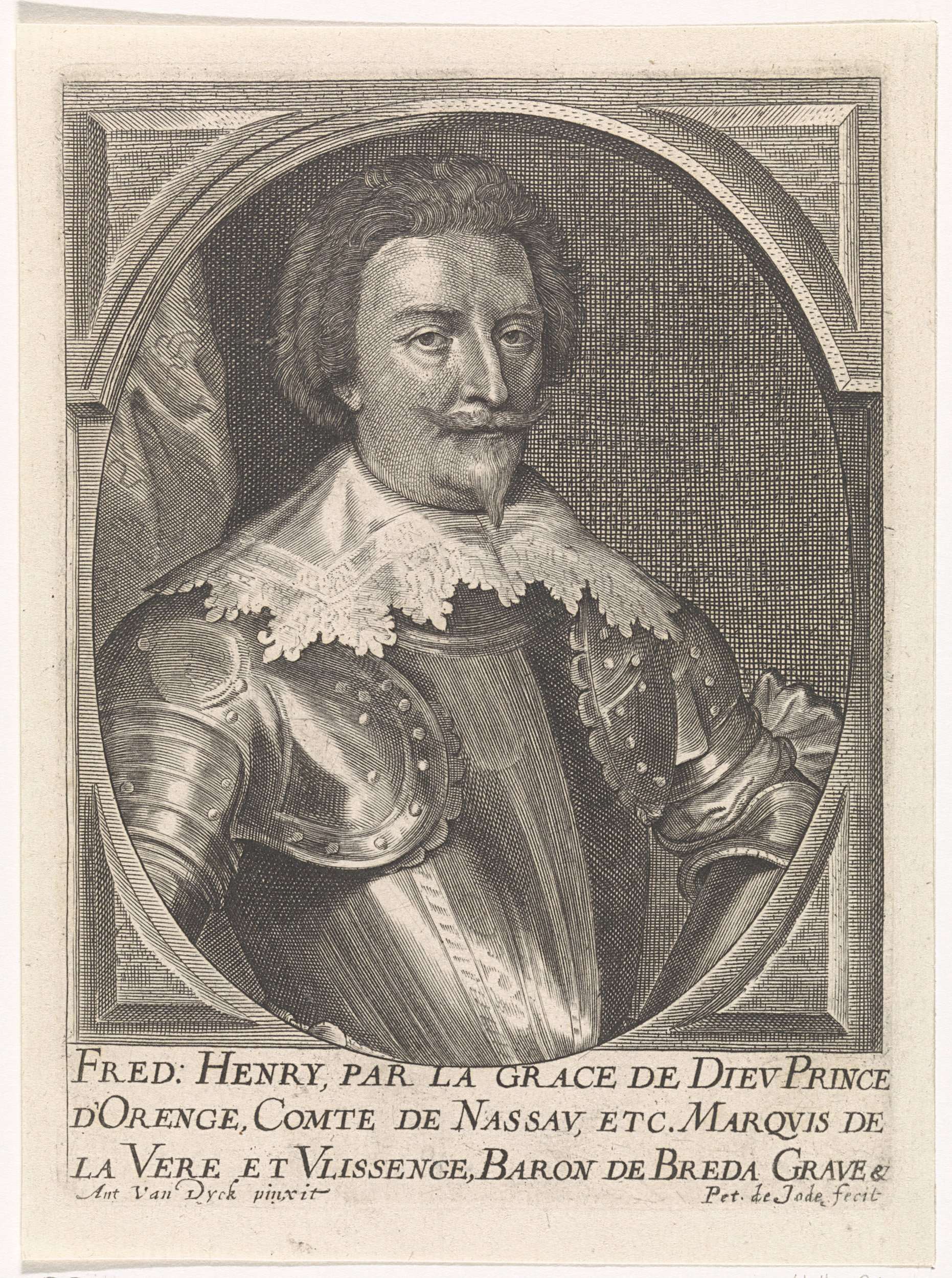 Busteportret van Frederik Hendrik, in harnas. Het portret is gevat in een ovale omlijsting met vierkant randwerk. In de marge een drieregelig onderschrift in het Frans.