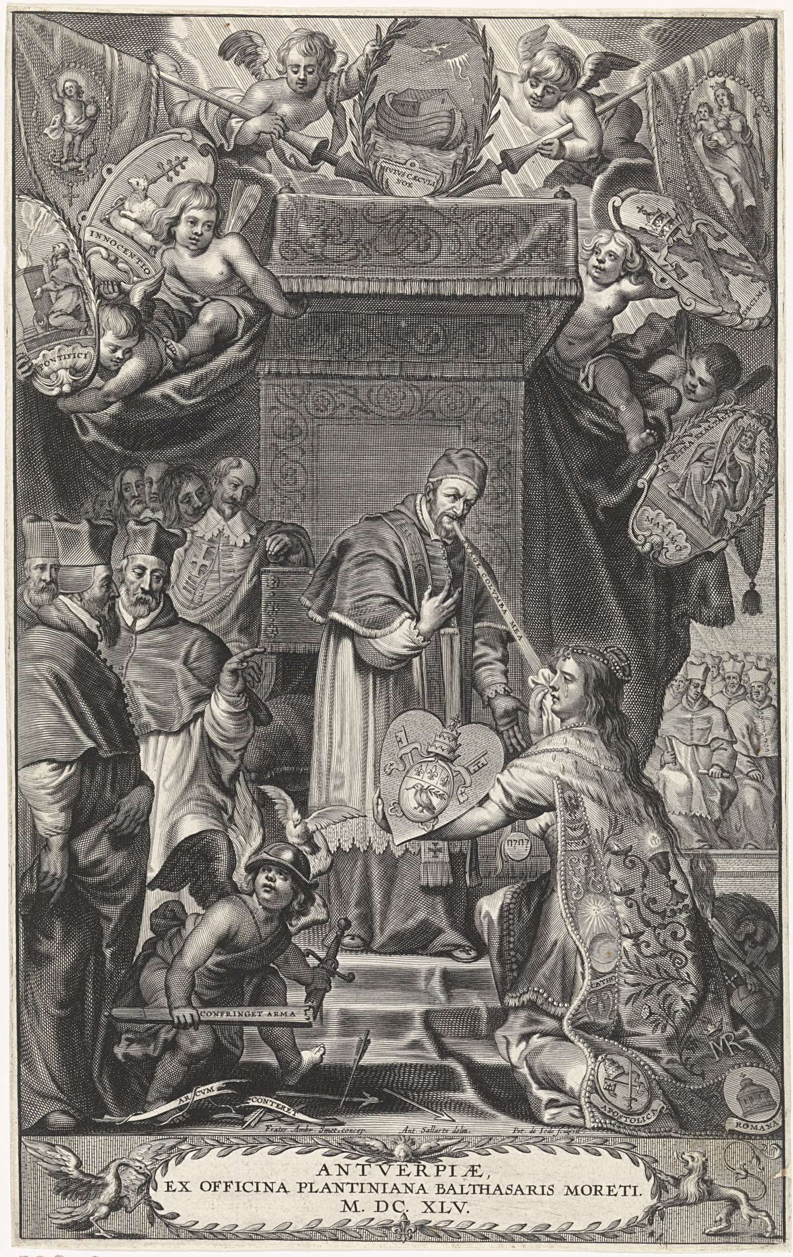 Allegorische voorstelling met in het midden paus Innocentius X onder een baldakijn. Voor hem knielt een huilende, vrouwelijke personificatie met een hartvormig wapenschild in haar handen. Achter haar een hond met een fakkel, spelend met een rijksappel. Rondom hen staan en zitten toekijkende kardinalen. Links op de voorgrond een putto met gebroken wapens. Boven het ...