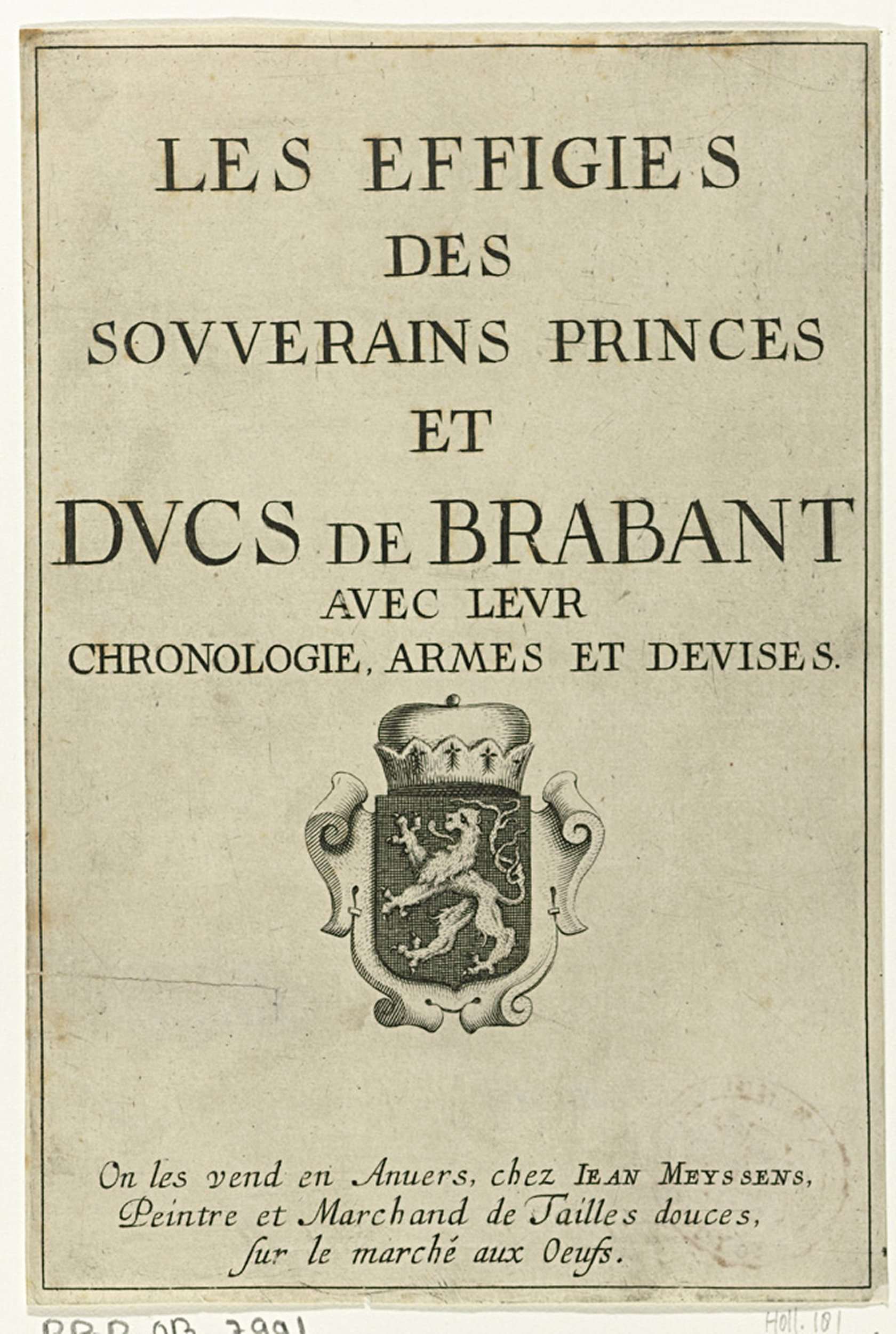 Titelpagina met de titel van het boek en het wapenschild van het Hertogdom Brabant.