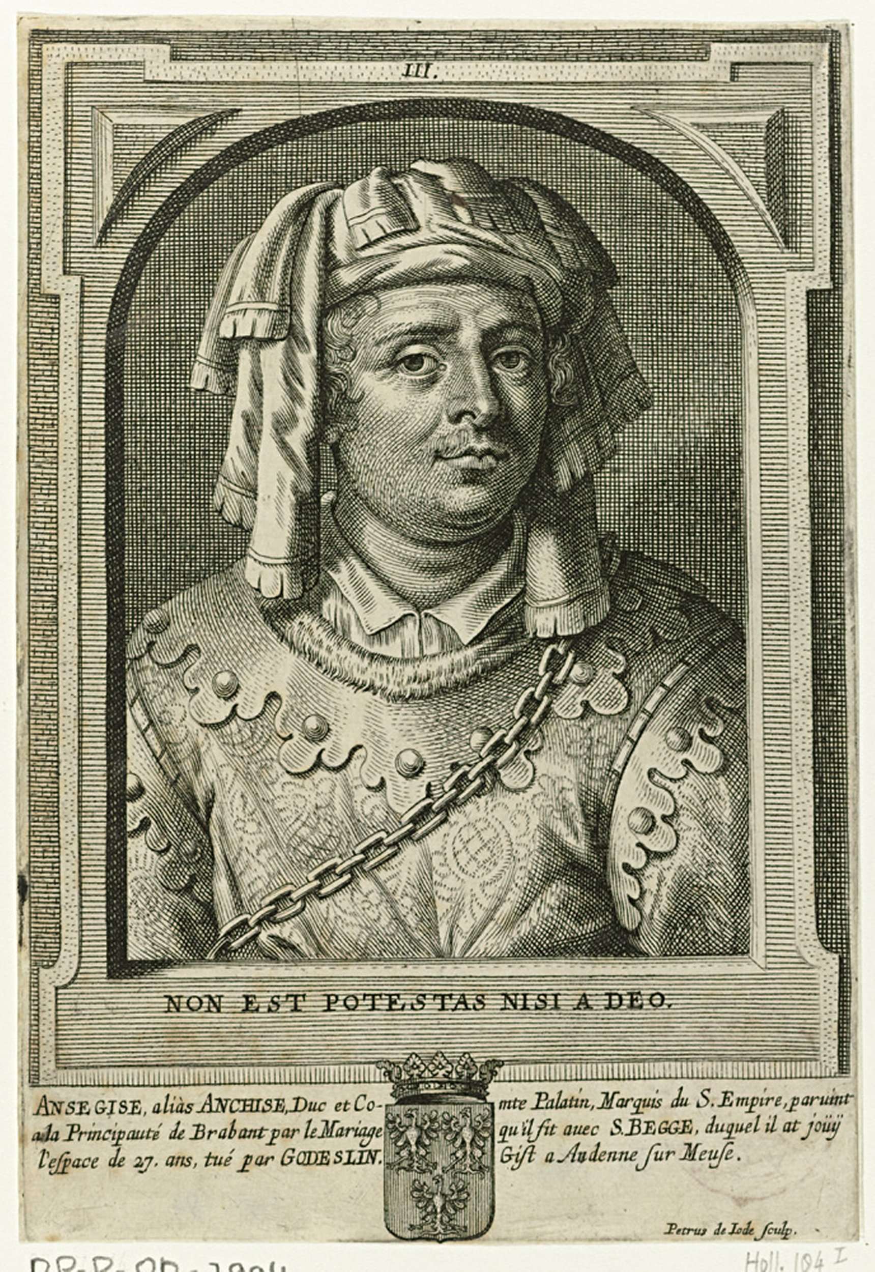 Busteportret van Ansegisel, met hoofddoek. Het portret is gevat in een boogvormige omlijsting met vierkant randwerk en een motto in het Latijn. In de marge het wapenschild van de geportretteerde en een drieregelig onderschrift in het Frans. Prent uit een boek waarin 54 prenten met portretten.