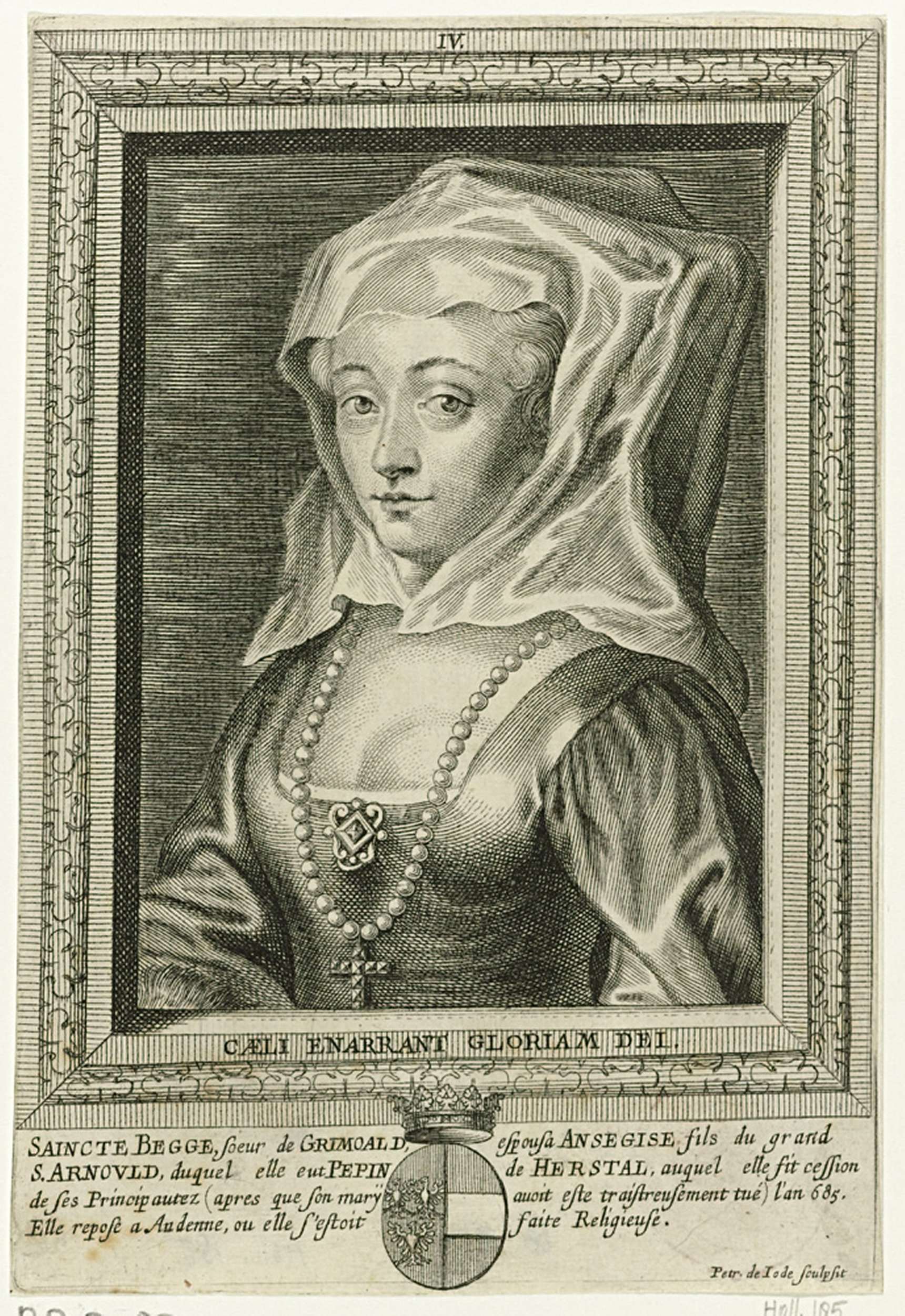 Busteportret van Begge van Andenne, met sluier. Het portret is gevat in een rechthoekige omlijsting met een motto in het Latijn. In de marge het wapenschild van de geportretteerde en een vierregelig onderschrift in het Frans. Prent uit een boek waarin 54 prenten met portretten.