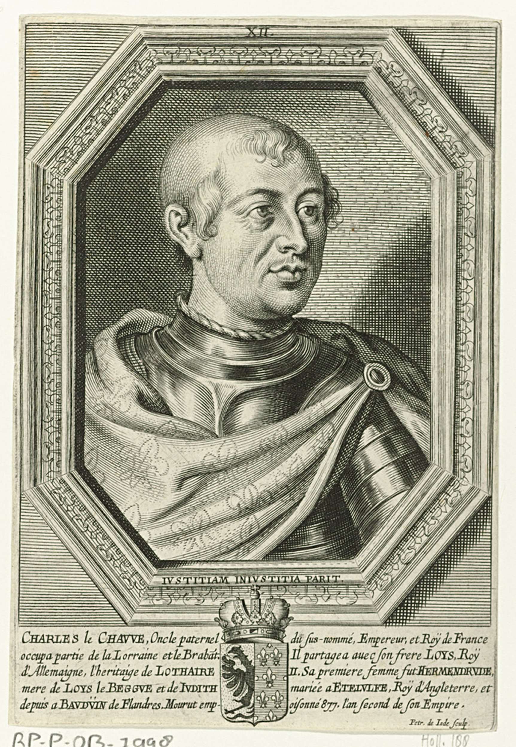 Busteportret van Karel II de Kale, in harnas. Het portret is gevat in een achthoekige omlijsting met een motto in het Latijn. In de marge het wapenschild van de geportretteerde en een vijfregelig onderschrift in het Frans. Prent uit een boek waarin 54 prenten met portretten.