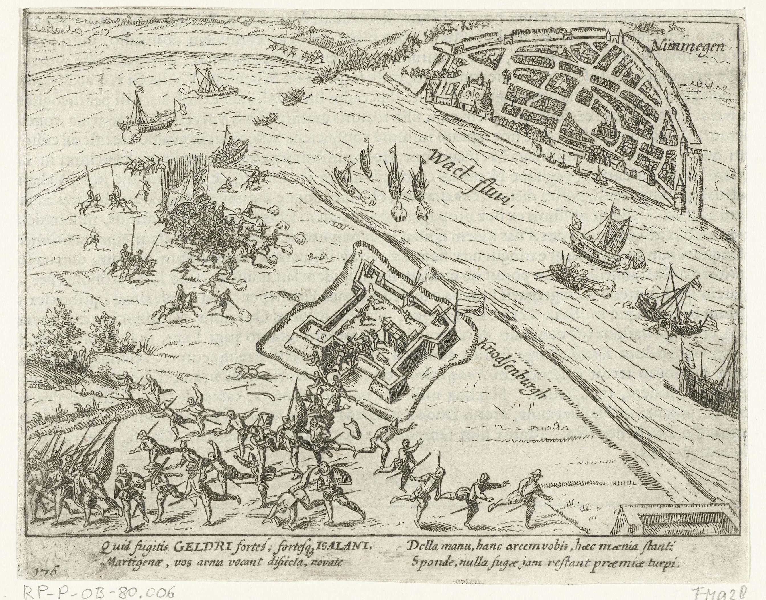 Engelsen bij Nijmegen door Parma uit de vesting bij Lent verjaagd, 15 november 1585. De Engelse soldaten vluchten uit Fort Knodsenburg als het leger van Parma over de Waal optrekt. Met onderschrift van 4 regels in het Latijn. Genummerd: 176. Bedrukt op verso met tekst in het Latijn.