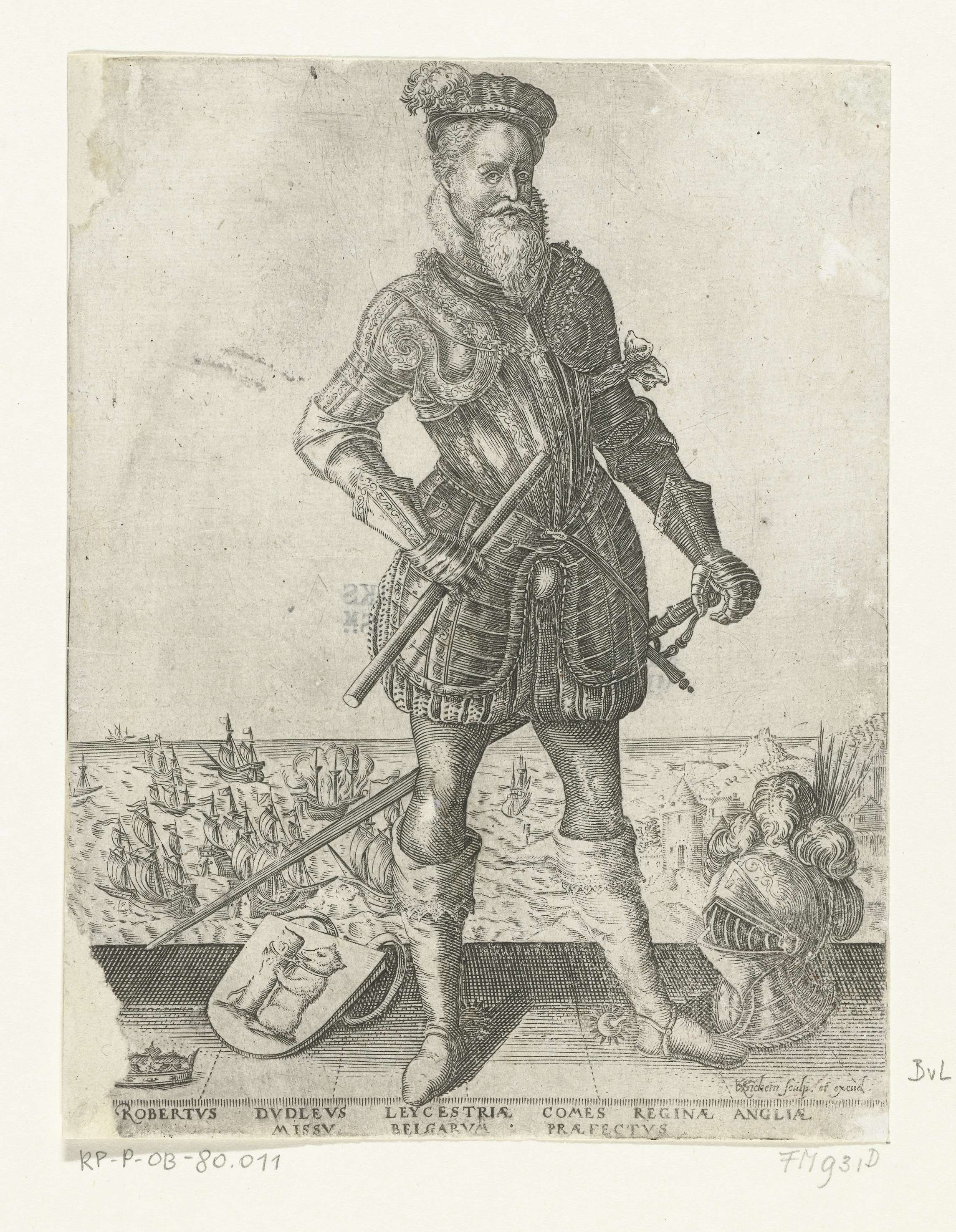 Portret van Robert Dudley, graaf van Leicester. Staande, ten voeten uit, op de grond een kroon, familiewapen en helm. Op de achtergrond schepen voor de kust.