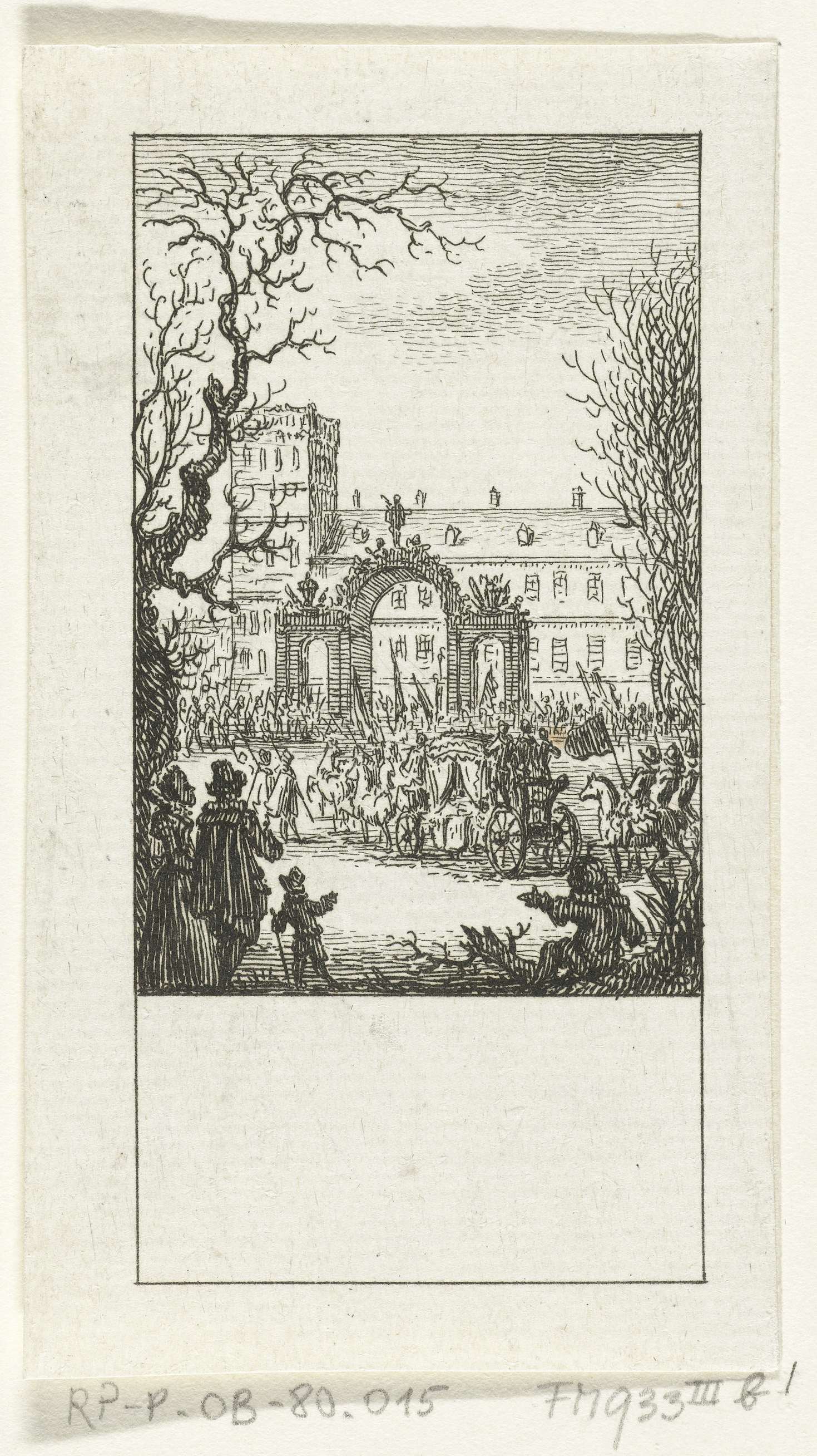 Aankomst van Robert Dudley, graaf van Leicester, te 's-Gravenhage op 6 januari 1586. Feestelijke ontvangst van de rijtuig met de graaf bij een triomfpoort.