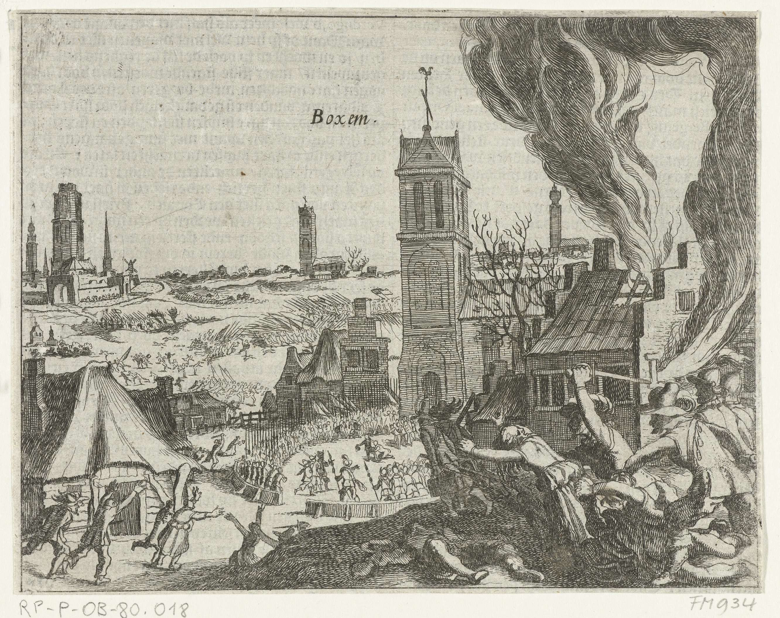 Slag bij Boksum in Friesland, 26-27 januari 1586. Het Staatse leger door de Spanjaarden verslagen. Gevechten in het open veld en soldaten bij de kerk in Boksum, in de verte Leeuwarden, Winsum en Wielsryp. Bedrukt op achterzijde met tekst in het Nederlands.