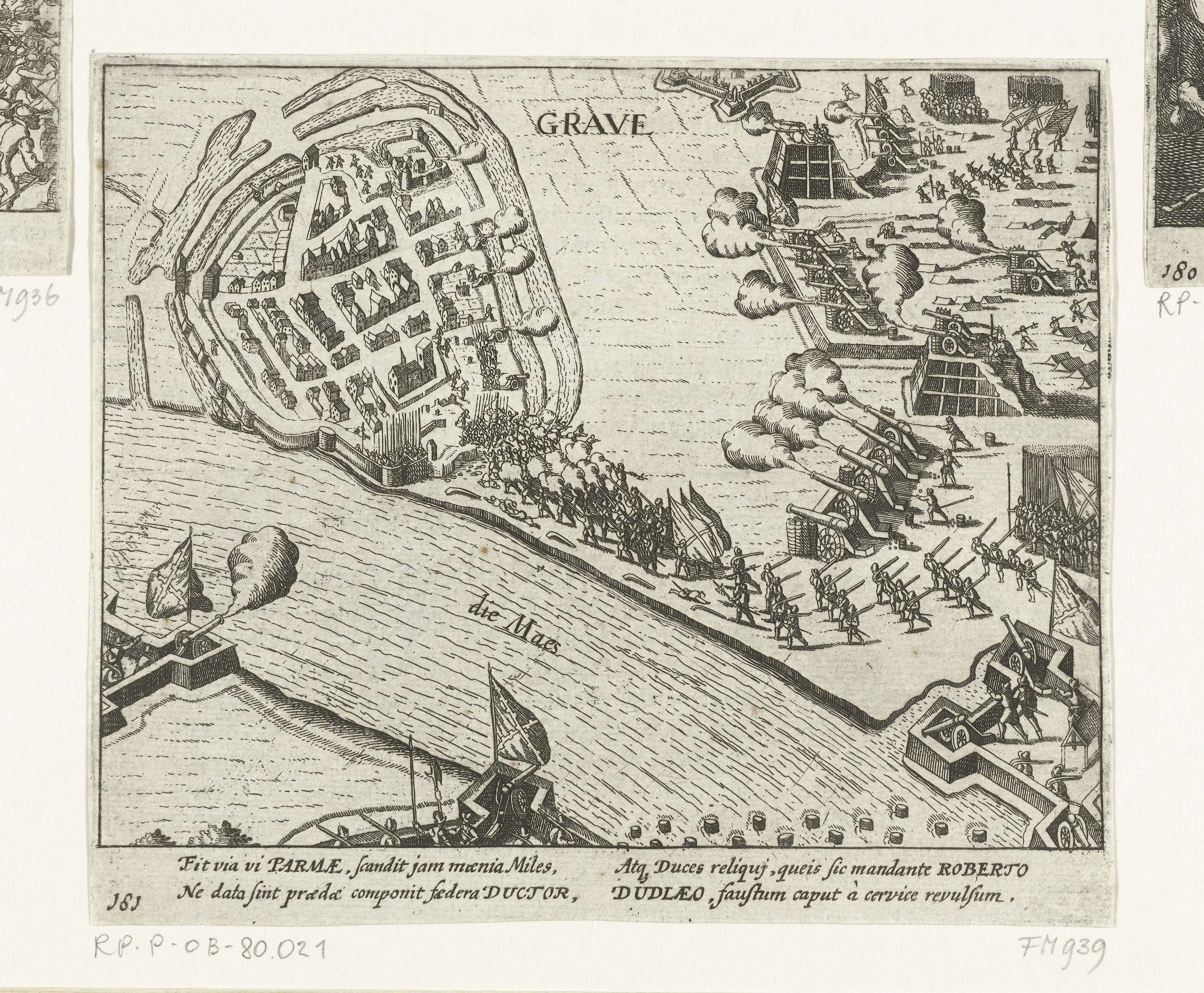 Beleg en inname van Grave door Parma, 6 juni 1586. Het leger van Parma bestormt een bres in de muren. Op de voorgrond de Maas. Met onderschrift van 4 regels in het Latijn. Genummerd 181. Bedrukt op achterzijde met tekst in het Latijn.