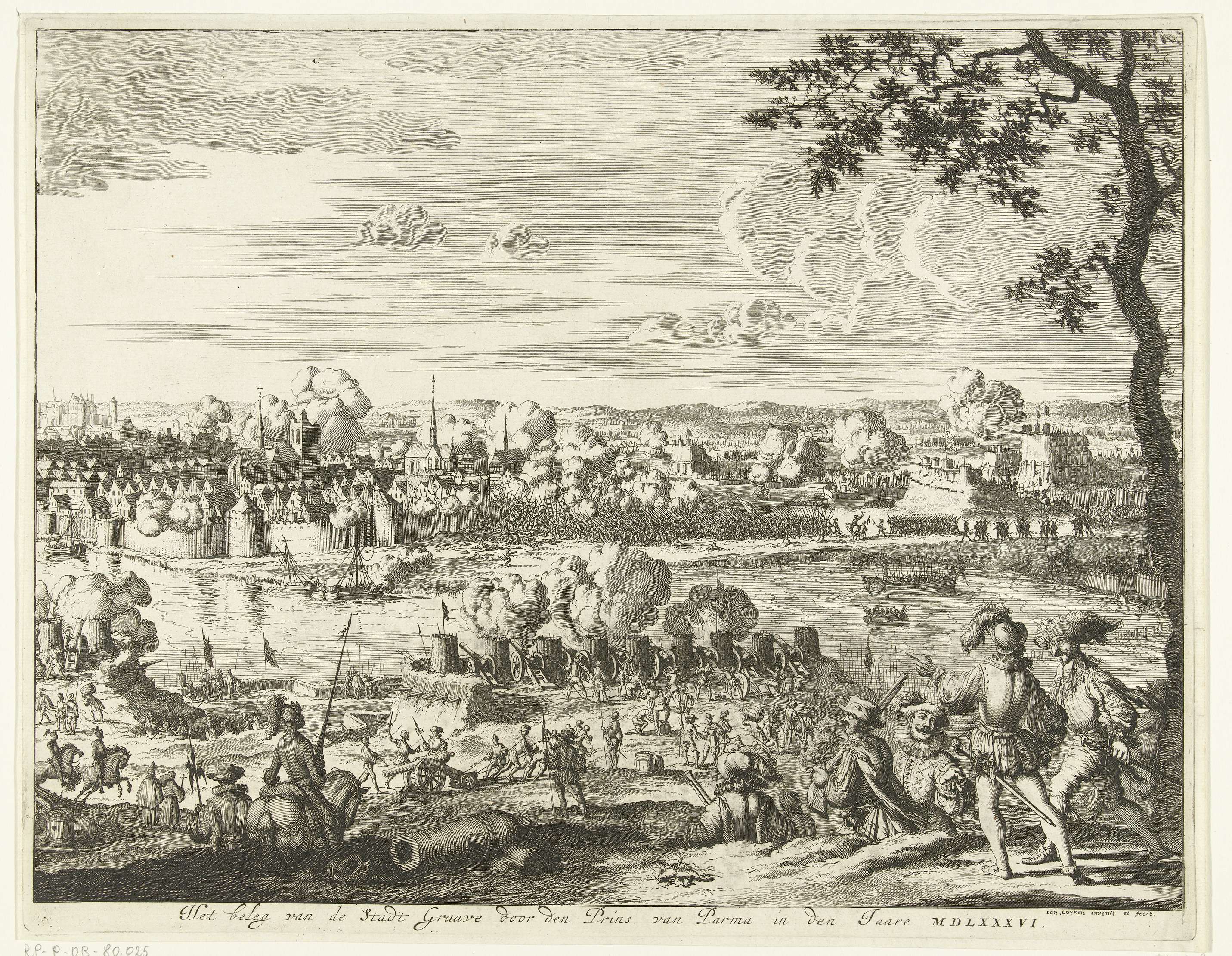 Beleg en bestorming van Grave door de hertog van Parma, 6 juni 1586. Gezicht op de stad vanuit de positie van de belegerende Spaanse troepen. In het midden bestormen de troepen een bres in de stadsmuren.