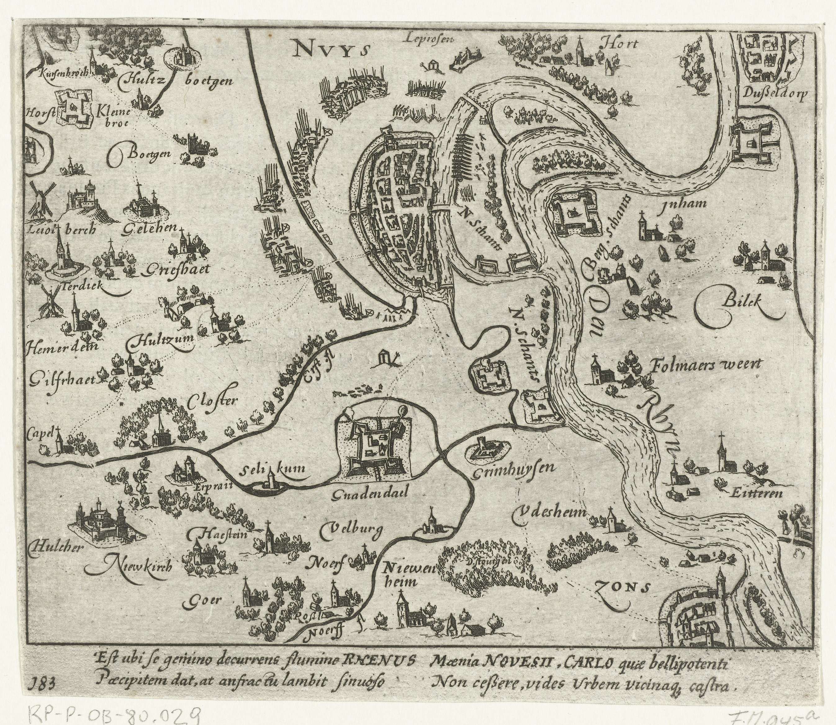 Plan van Neuss aan de Rijn met de dorpen in het omliggende gebied, 1586. Met onderschrift van 4 regels in het Latijn. Genummerd 183. Bedrukt op achterzijde met tekst in het Latijn.