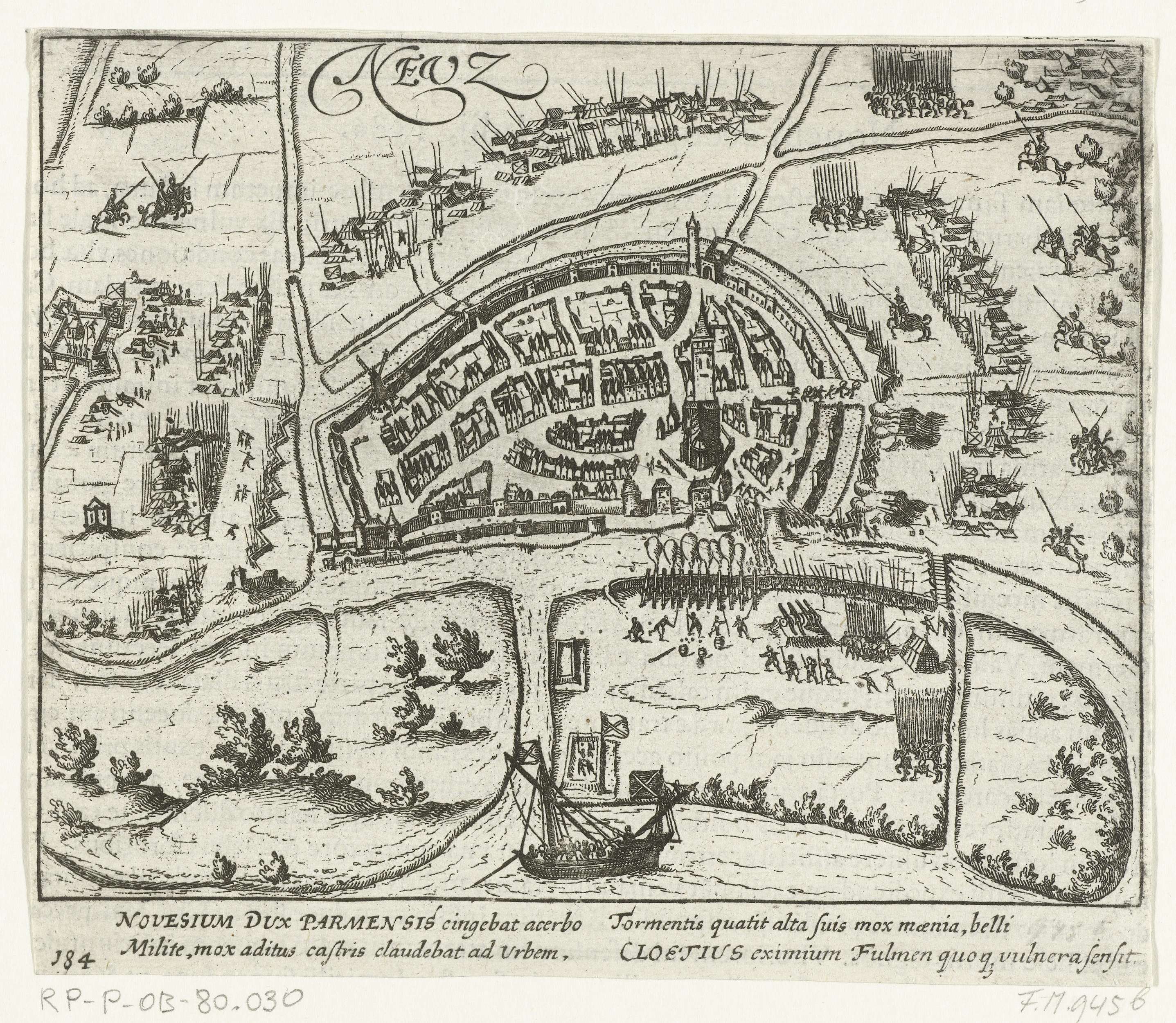 Beleg van Neuss door de hertog van Parma, 1586. Plan van de stad met de belegerende troepen om de stad. Met onderschrift van 4 regels in het Latijn. Genummerd 184. Bedrukt op achterzijde met tekst in het Latijn.