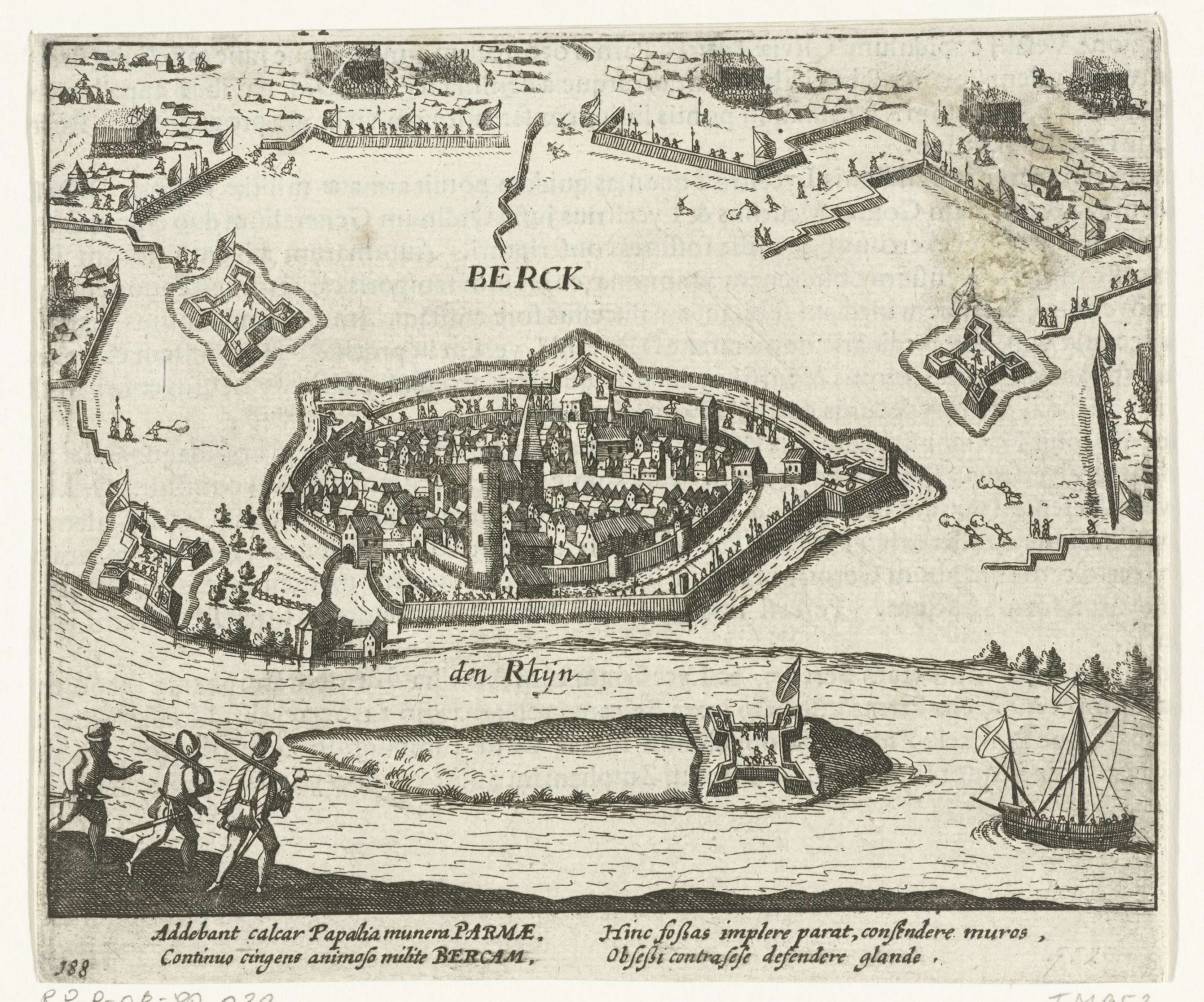Beleg van Rheinberg door keurvorst Ernst van Beieren, september 1586. Episode uit de Keulse Oorlog. Met onderschrift van 4 regels in het Latijn. Genummerd 188. Bedrukt op achterzijde met tekst in het Latijn.