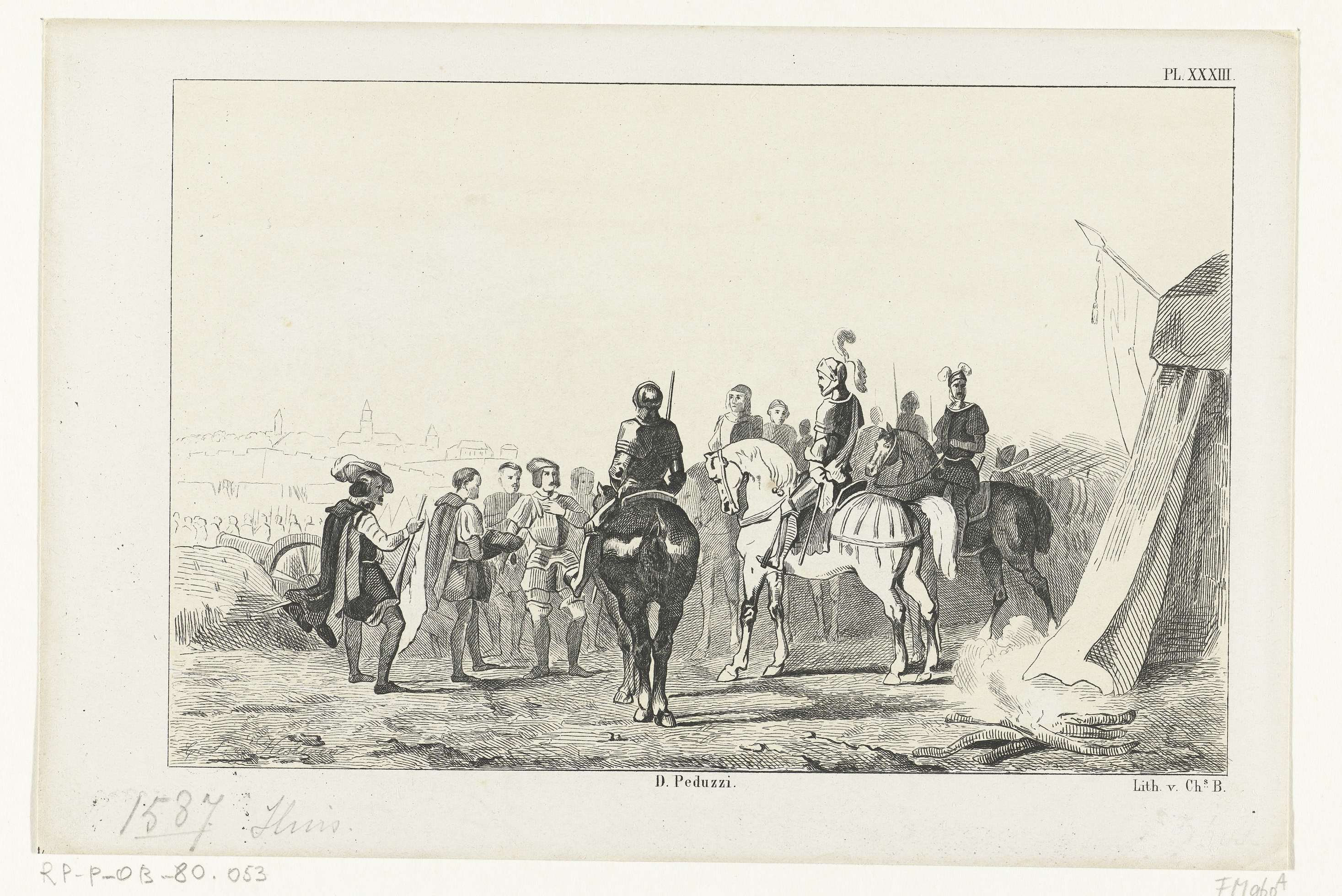 Overgave van Sluis na belegering door het leger van Parma, 5 augustus 1587. Vertegenwoordigers van de stad en ruiters, waaronder de hertog van Parma, te paard voor legertent.