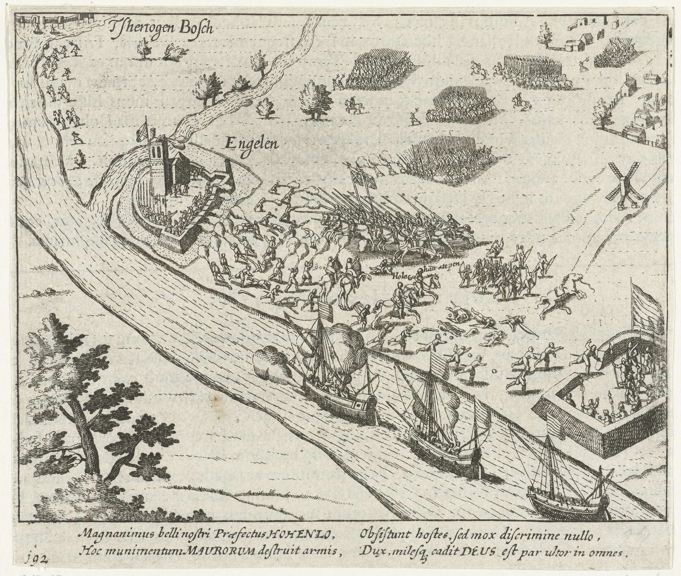 Slag bij Engelen in de Kempen bij Den Bosch, 13 juli 1587. Troepen van Hohenlohe verdedigen een versterkte schans bij Engelen (later versterkt en omgedoopt tot Crèvecoeur). Bij de slag sneuvelt Haultepenne. Met onderschrift van 4 regels in het Latijn. Genummerd 192. Bedrukt op achterzijde met tekst in het Latijn.