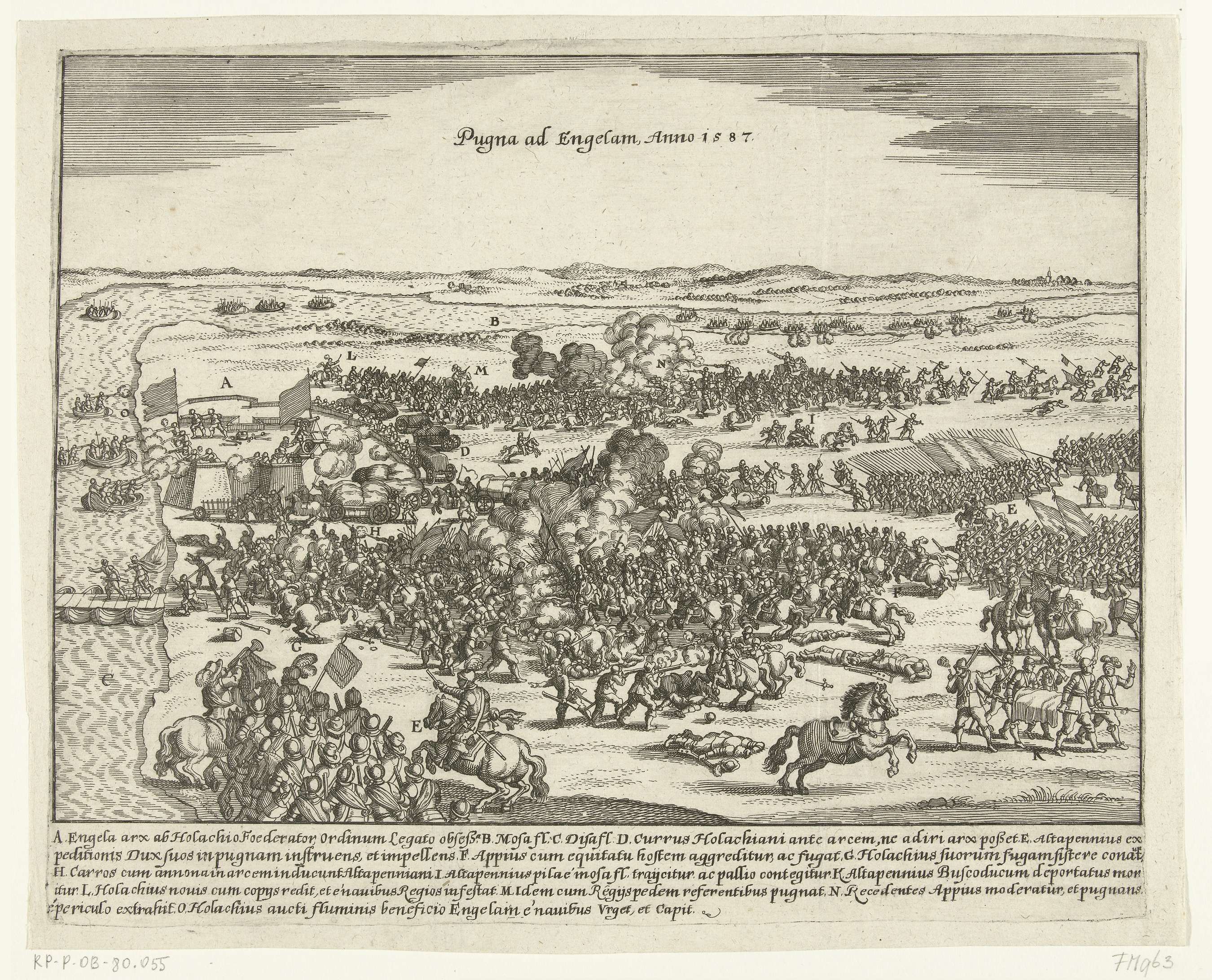 Slag bij Engelen in de Kempen bij Den Bosch, 13 juli 1587. Troepen van Hohenlohe verdedigen een versterkte schans bij Engelen (later versterkt en omgedoopt tot Crèvecoeur). Bij de slag sneuvelt Haultepenne, rechtsvoor wordt zijn lichaam weggedragen. Bovenaan de titel, in het onderschrift de legenda A-O in het Latijn.