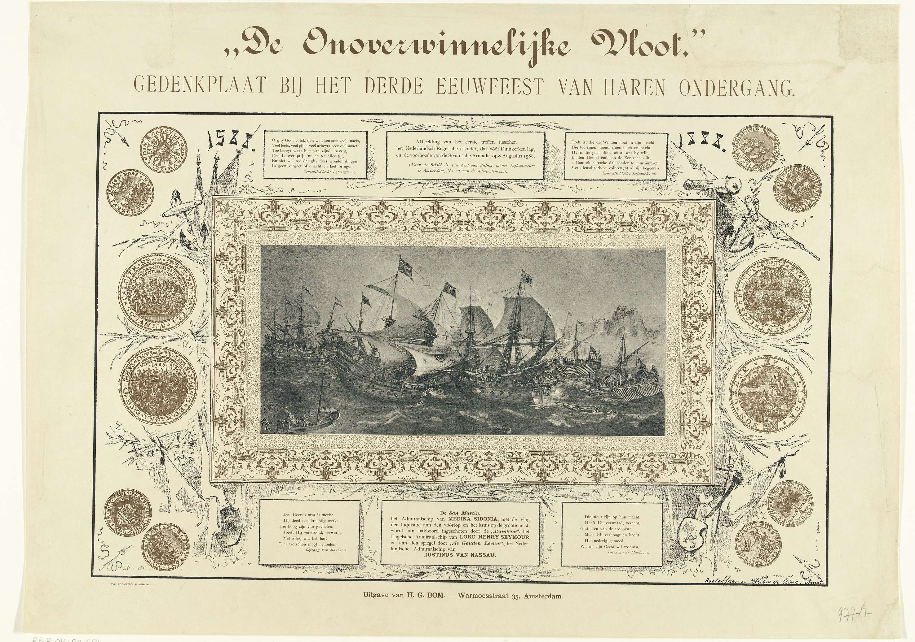 Gedenkplaat bij het derde eeuwfeest in 1888 van de overwinning op de Spaanse Armada of Onoverwinnelijke vloot, tussen 31 juli en 12 augustus 1588. Centraal een reproductie naar het schilderij met Hollandse en Engelse schepen in gevecht met de Spaanse Armada bij Cadiz op 29 april 1587 door Aert Anthonisz. Hieromheen een ornamentele omlijsting met ...