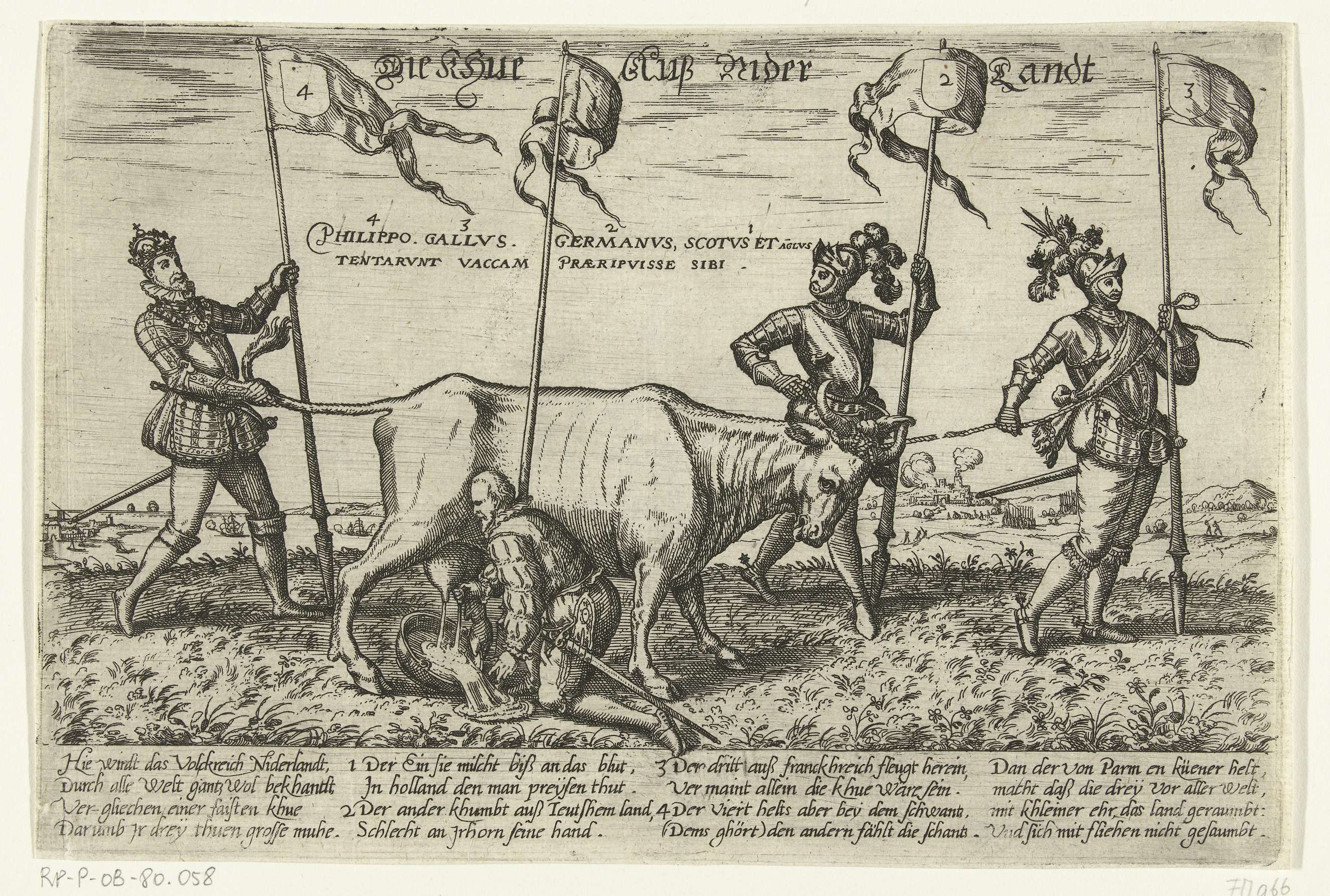 Politieke allegorie van ca. 1587 waarin de Nederlandse Koe wordt gemolken door een Schot of Engelsman (mogelijk de graaf van Leicester), bij de horens gevat door een Duitser (mogelijk Matthias van Oostenrijk of Willem van Oranje), aan een (gebroken) touw weggeleid door een Fransman (mogelijk de hertog van Anjou) terwijl Filips II slechts de staart ...
