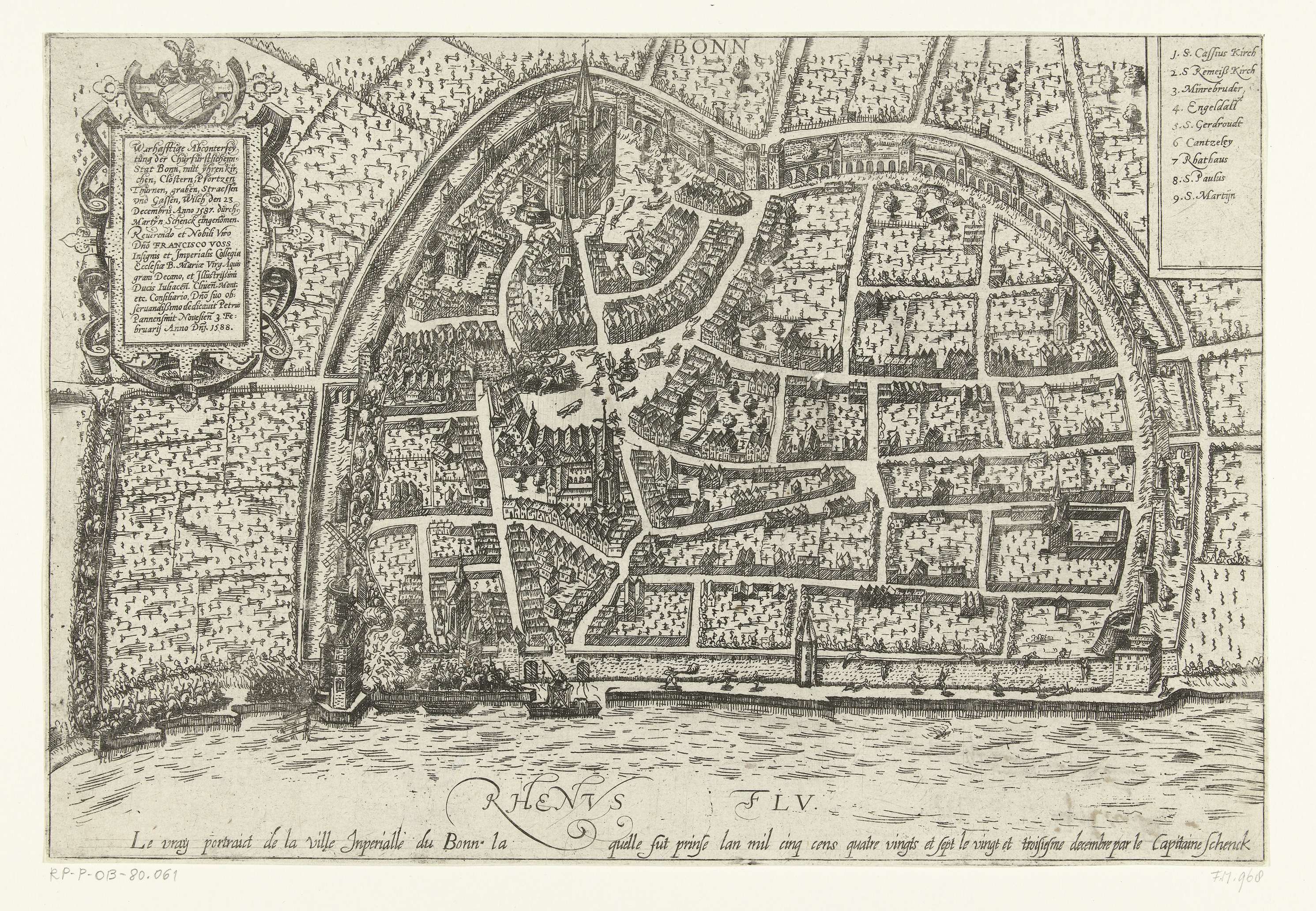 Plattegrond van de stad Bonn, door Maarten Schenck voor Truchsess gewonnen, 23 december 1587. Episode uit de Keulse Oorlog. Linksboven een cartouche met opschrift van 18 regels in het Duits, rechtsboven de legenda 1-9 in het Duits.