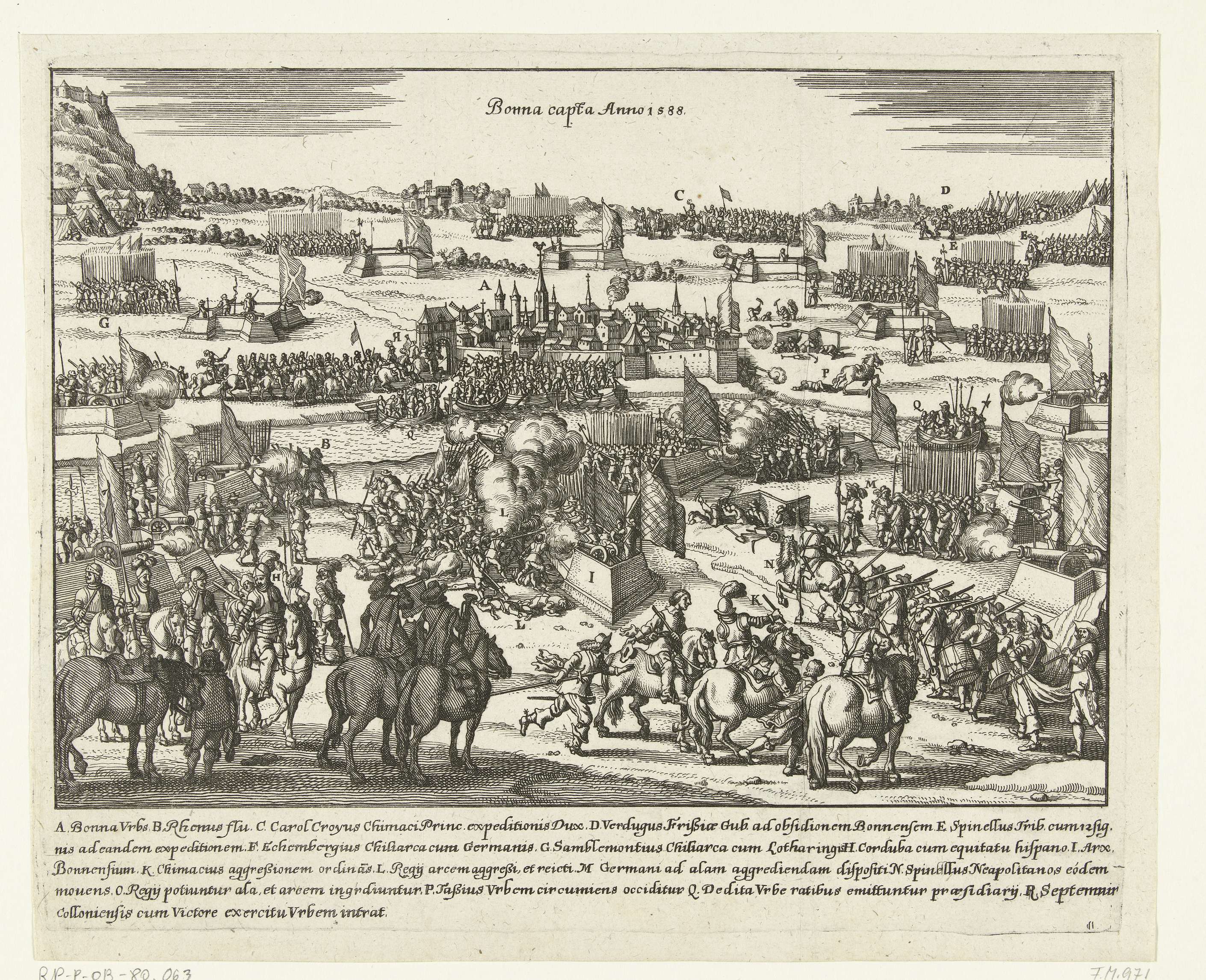 Verovering van Bonn na een beleg van 9 maanden, 19 september 1588. Gevechten rond de schansen. Episode uit de Keulse Oorlog. In het onderschrift de legenda A-R in het Latijn.