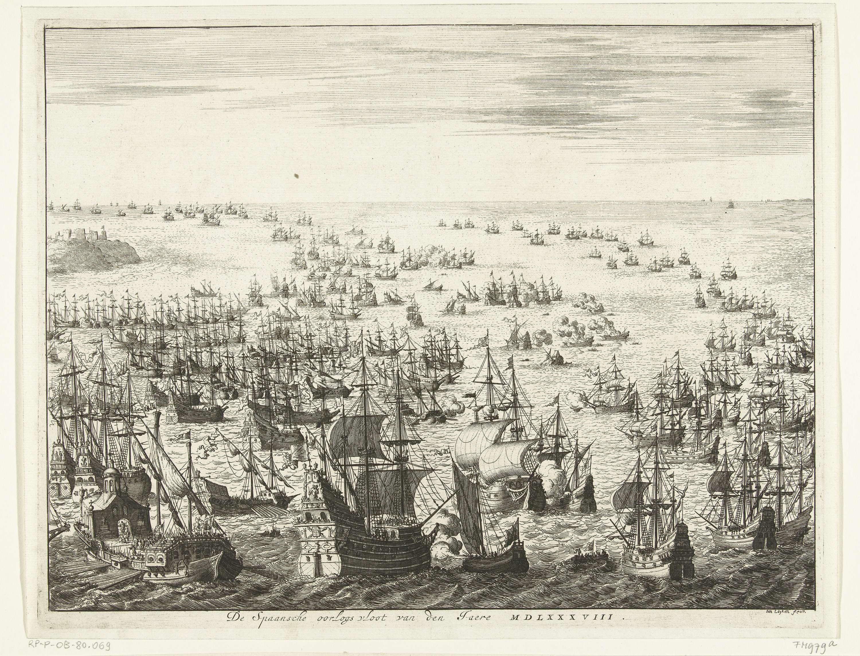 Ondergang van de Spaanse Armada of Onoverwinnelijke vloot, tussen 31 juli en 12 augustus 1588. Zeeslag tussen de Spaanse en gecombineerde Engelse en Nederlandse vloten in het Kanaal. Op de voorgrond wordt een groot Spaans fregat beschoten door een klein Hollands schip met het vaandel van de stad Leiden, links een galei.