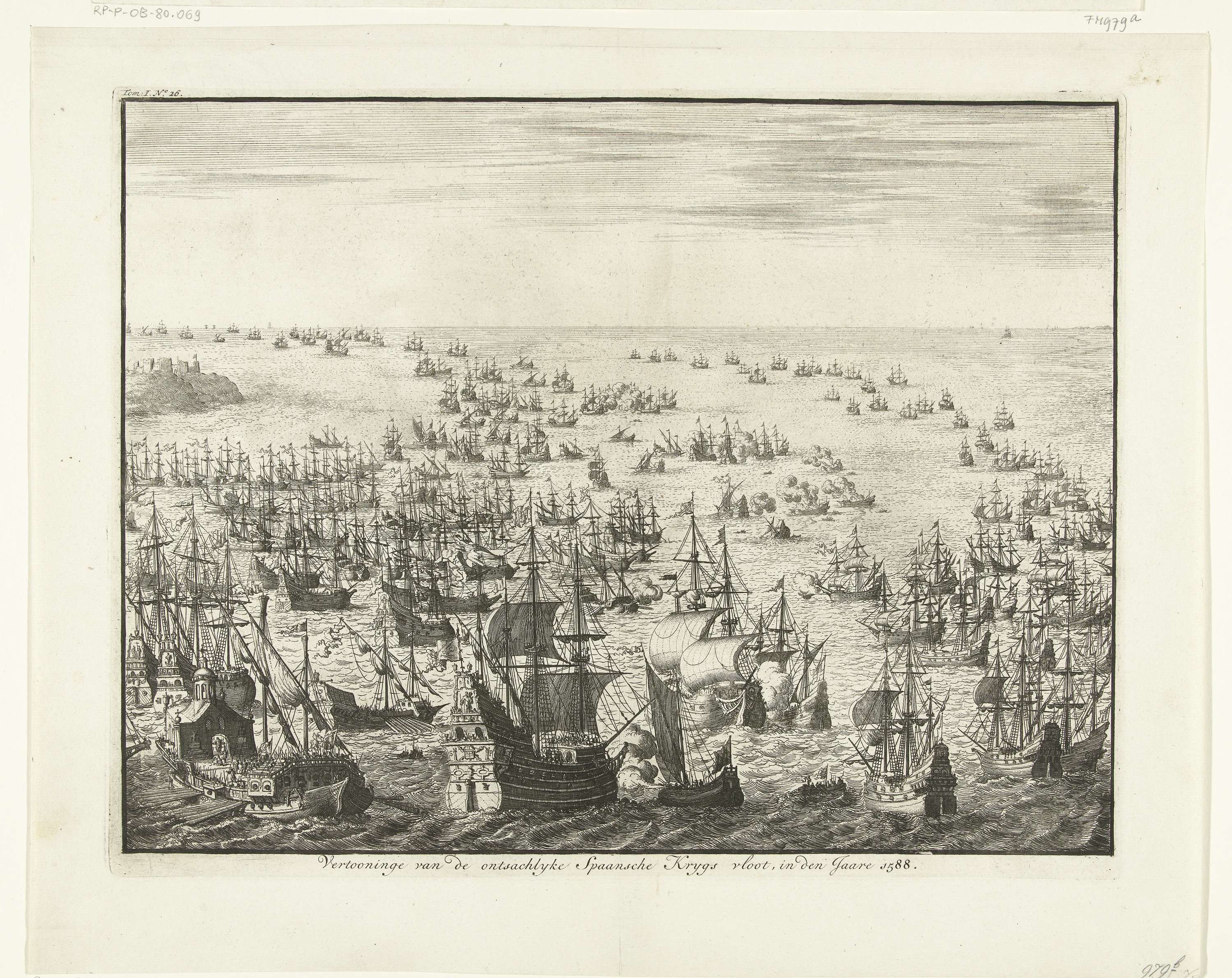 Ondergang van de Spaanse Armada of Onoverwinnelijke vloot, tussen 31 juli en 12 augustus 1588. Zeeslag tussen de Spaanse en gecombineerde Engelse en Nederlandse vloten in het Kanaal. Op de voorgrond wordt een groot Spaans fregat beschoten door een klein Hollands schip met het vaandel van de stad Leiden, links een galei.