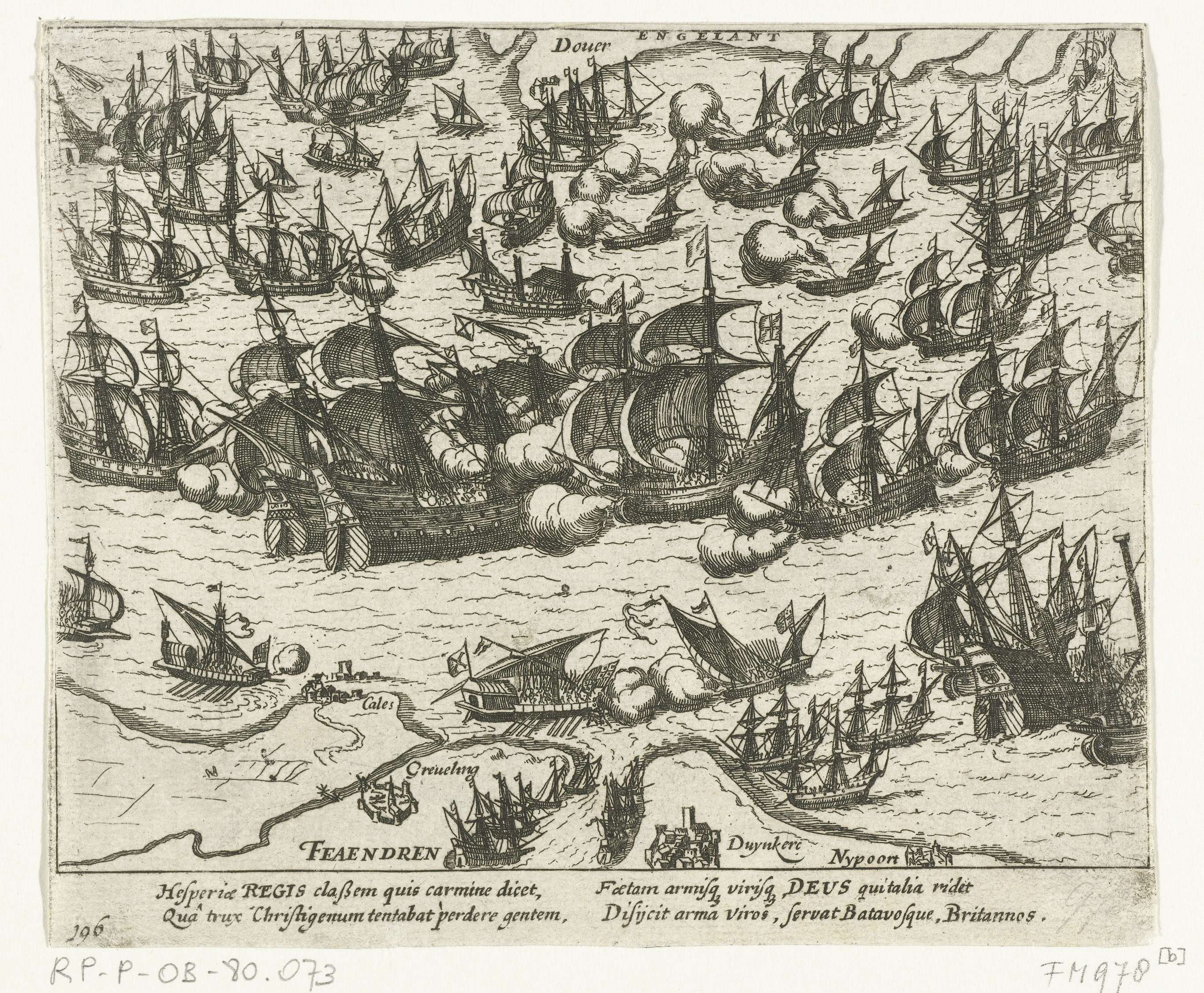 Zeeslag met de Spaanse Armada in het Kanaal, 1588. Onderaan de kust van Vlaanderen tussen Calais en Nieuwpoort, boven de Engelse kust bij Dover. Met onderschrift van 4 regels in het Latijn. Genummerd 196. Onbedrukt op achterzijde.