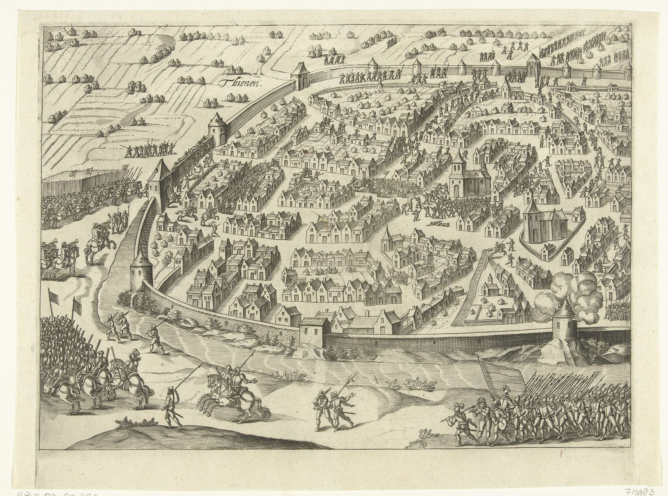 Tienen in Brabant verrast en ingenomen door het Staatse garnizoen van Bergen op Zoom, 1588. Plan van de stad met de oprukkende troepen en gevechten in de straten van de stad. Onder de voorstelling geen tekst.