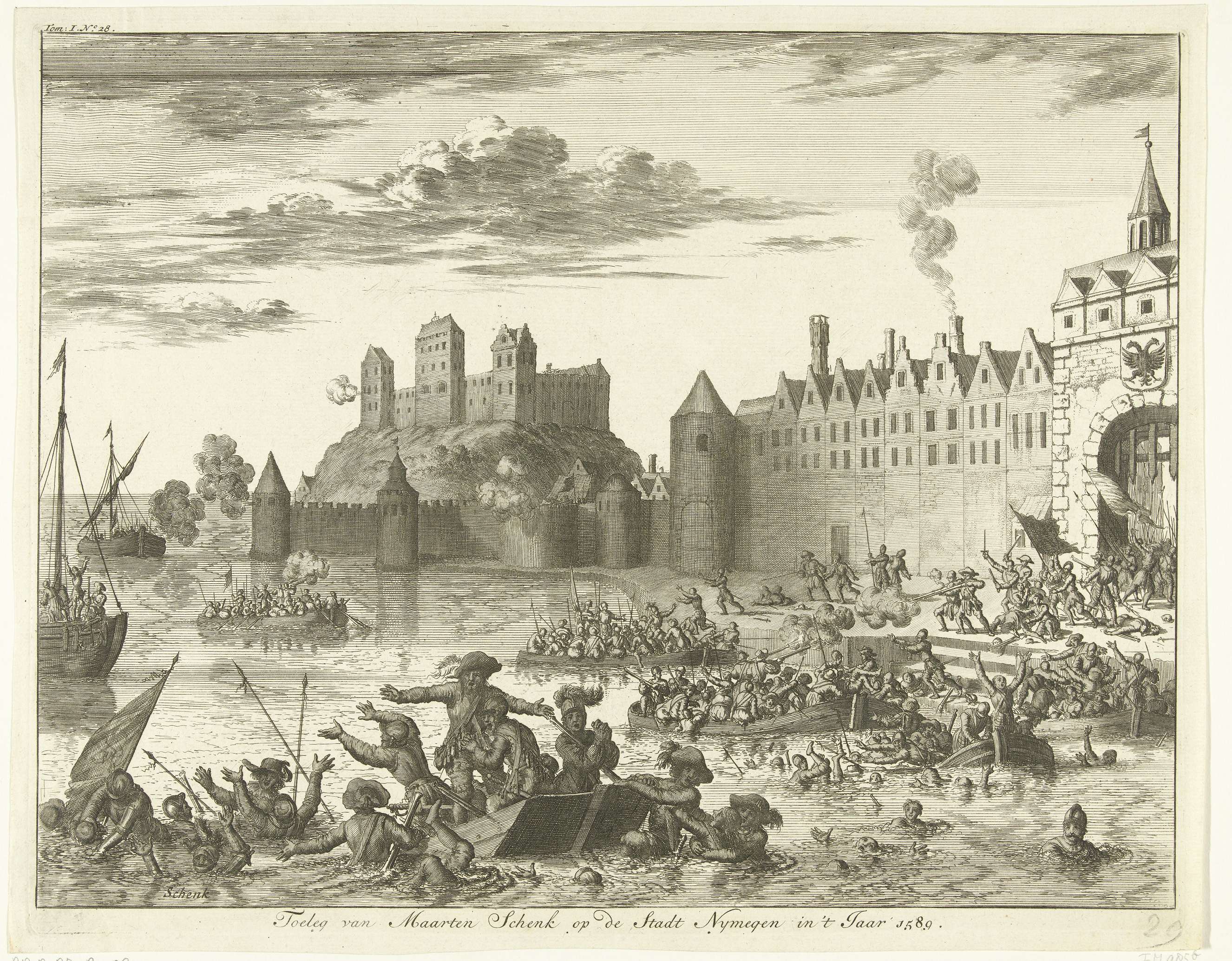 Mislukte aanval door troepen onder Maarten Schenck op de stad Nijmegen, 10 augustus 1589. Episode uit de Keulse Oorlog. Bij het vluchten uit de stad verdrinkt Schenck in de Waal.