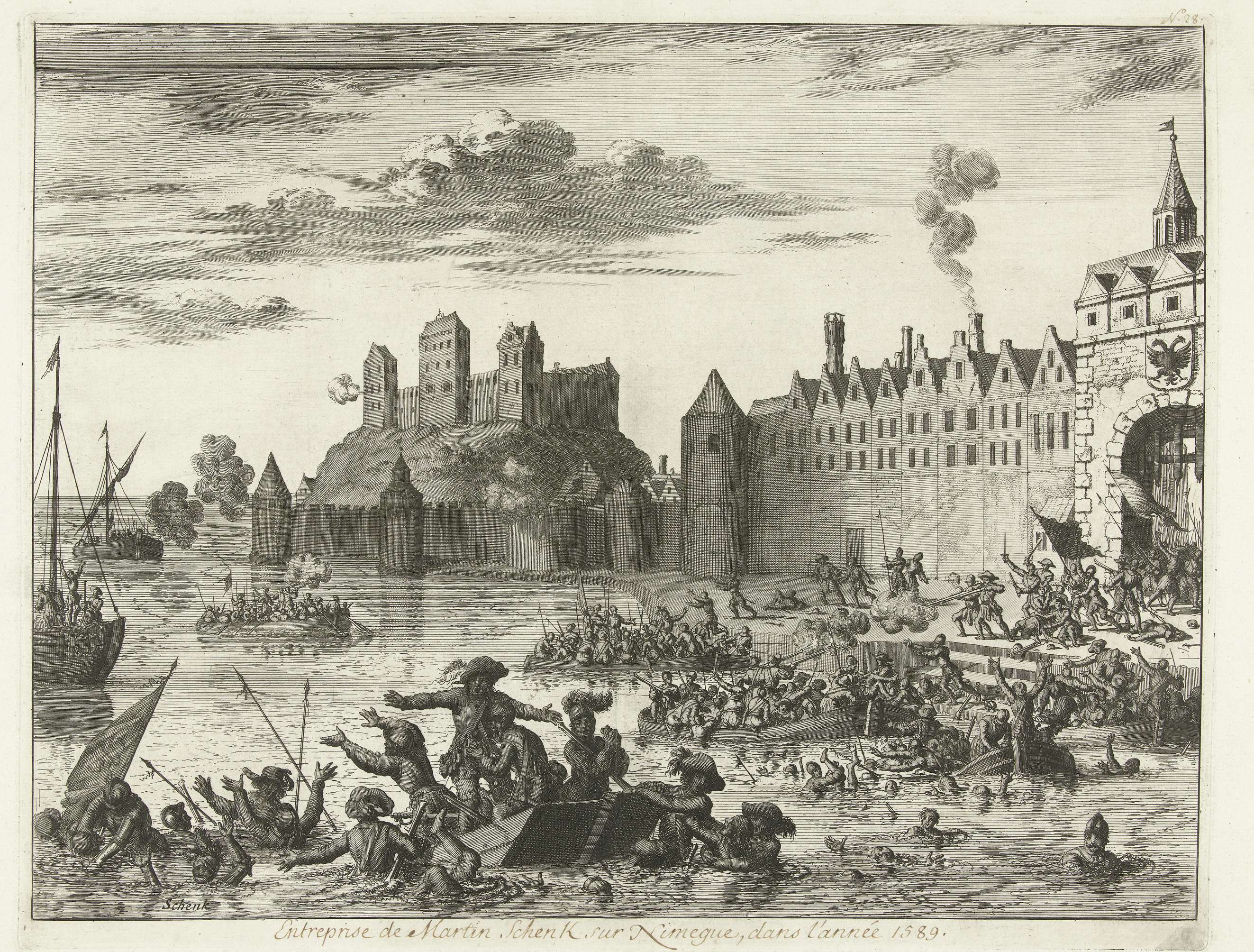 Mislukte aanval door troepen onder Maarten Schenck op de stad Nijmegen, 10 augustus 1589. Episode uit de Keulse Oorlog. Bij het vluchten uit de stad verdrinkt Schenck in de Waal.