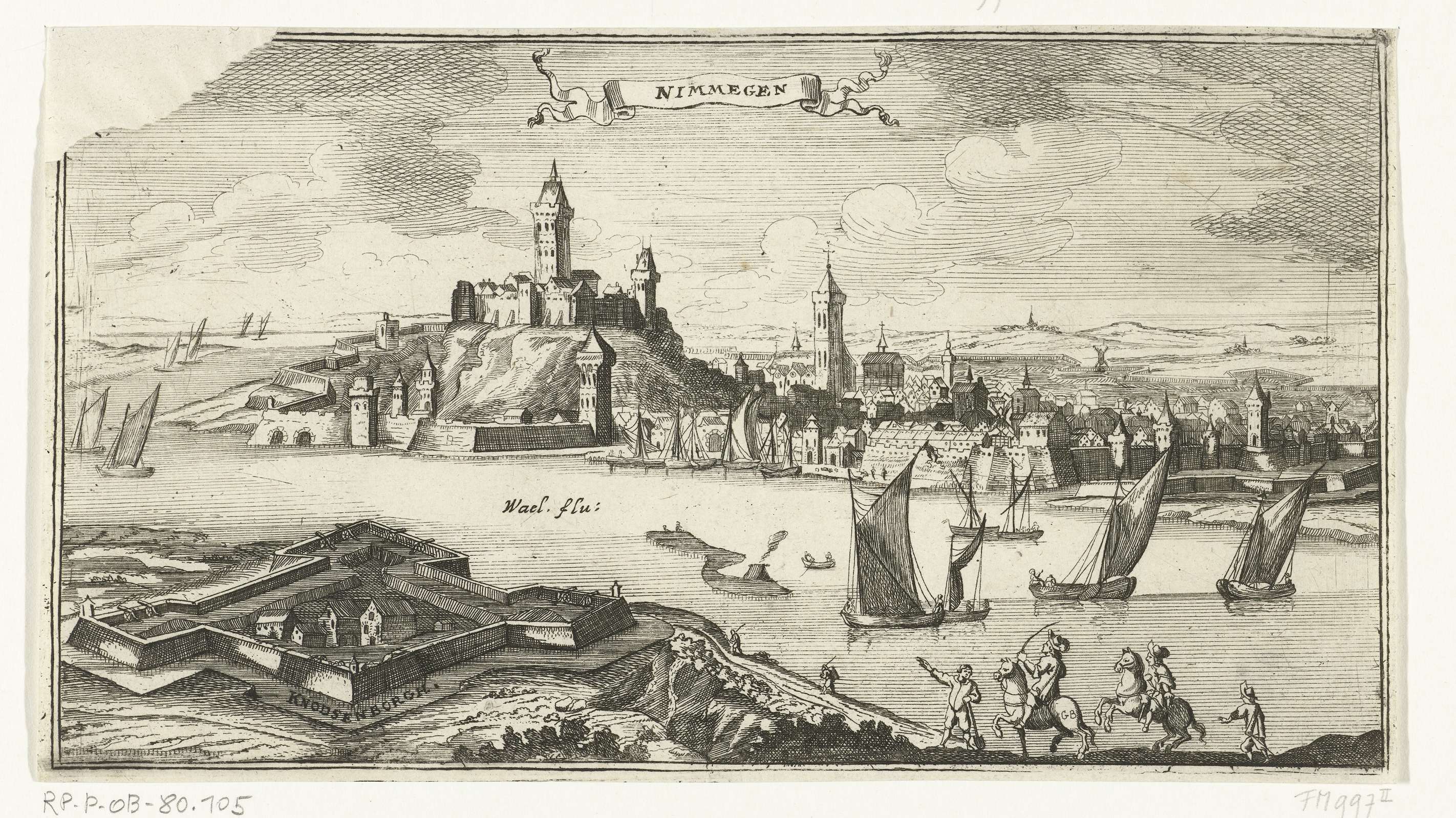 Gezicht op Nijmegen aan de Waal met het fort Knodsenburg op de voorgrond. Het fort gebouwd onder Maurits, 1590. De linkerbovenhoek ontbreekt.