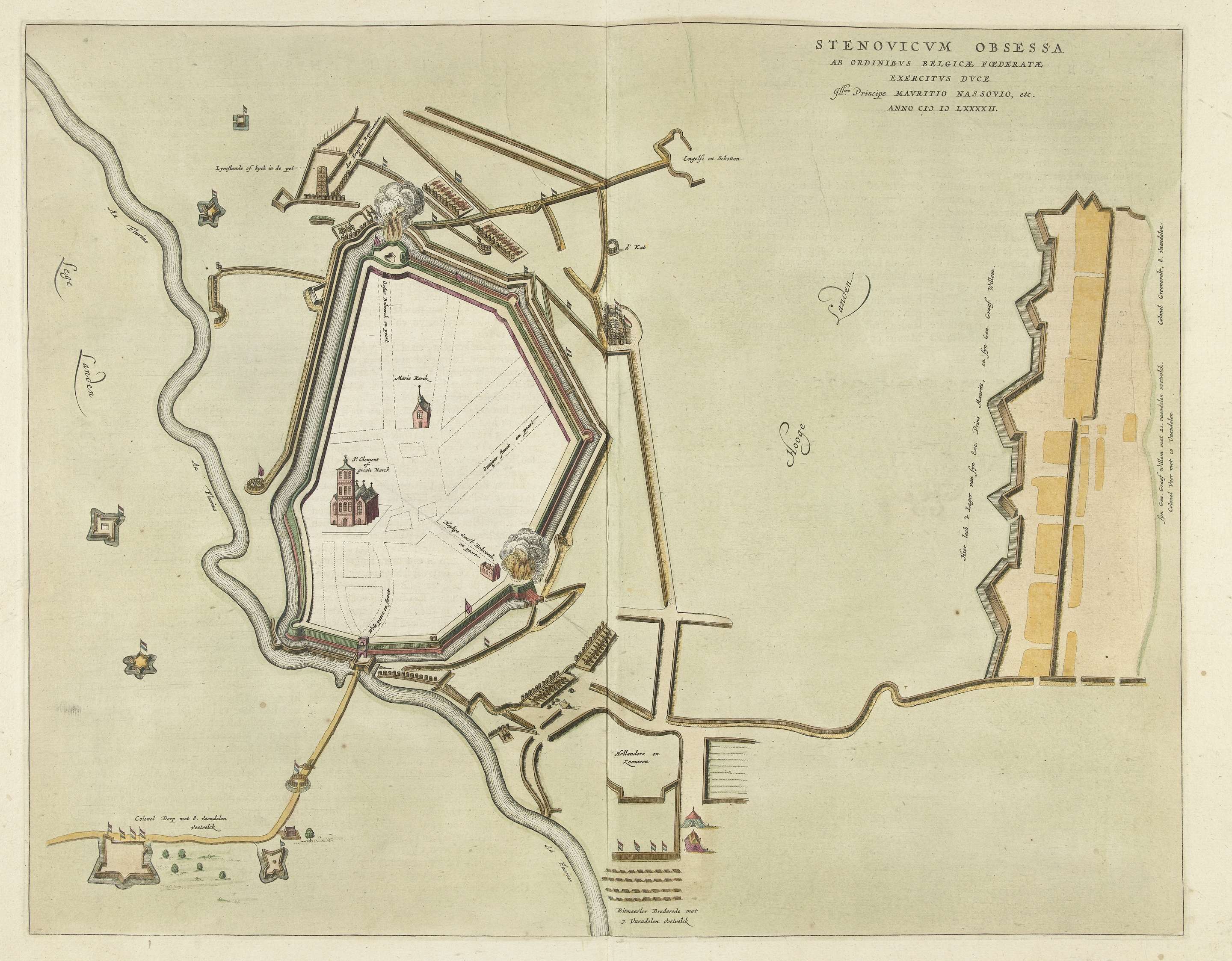 Kaart van Steenwijk belegerd door het Staatse leger onder Maurits, mei - juli 1592. Plan van Steenwijk met de stadswallen en verdedigingswerken en de posities van de belegerende troepen. In de stad zijn alleen twee kerken en enkele straten aangegeven. Bij de stadmuren twee explosies. Op een dubbelblad uit het het Stedenboek van Blaeu genomen, ...