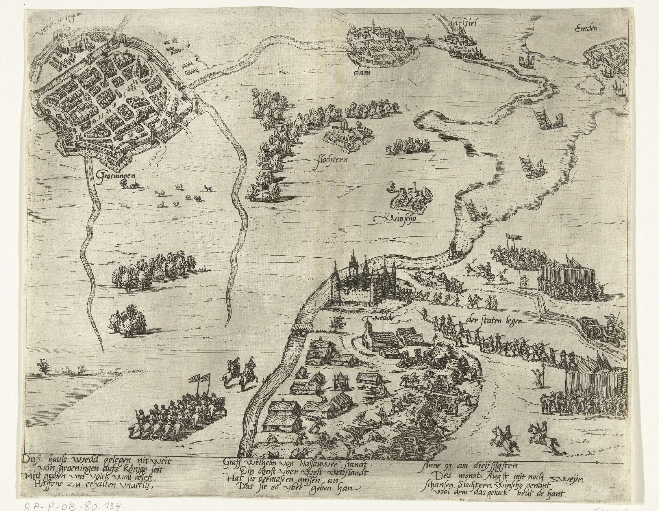 Verovering van schansen in de omgeving van Groningen door het Staatse leger onder graaf Willem Lodewijk van Nassau, 30 augustus 1593. Gezicht op het gebied rond Groningen met de vestingen te Slochteren en Winschoten. De verdediging bij het Huis te Wedde wordt versterkt. Het leger van Verdugo gelegen boven Groningen. Met onderschrift van 12 regels ...