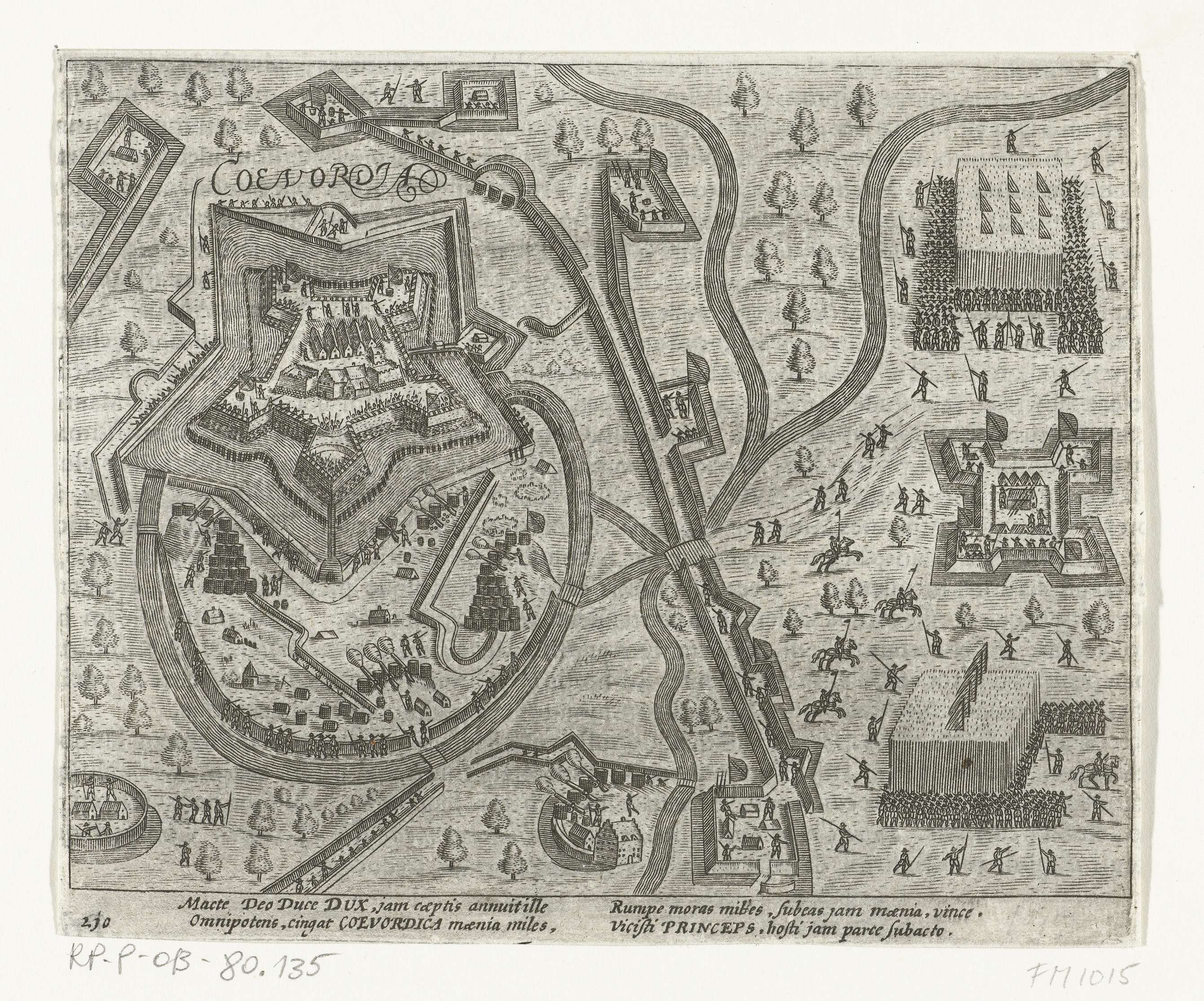 Beleg van Coevorden door het Staatse leger onder Maurits en Willem Lodewijk, juli - september 1592. Plan van de vesting met het kasteel Coevorden met het omringende land met de posities van de belegerende troepen. Met onderschrift van 4 regels in het Latijn. Genummerd 210. Bedrukt op achterzijde met tekst in het Latijn.