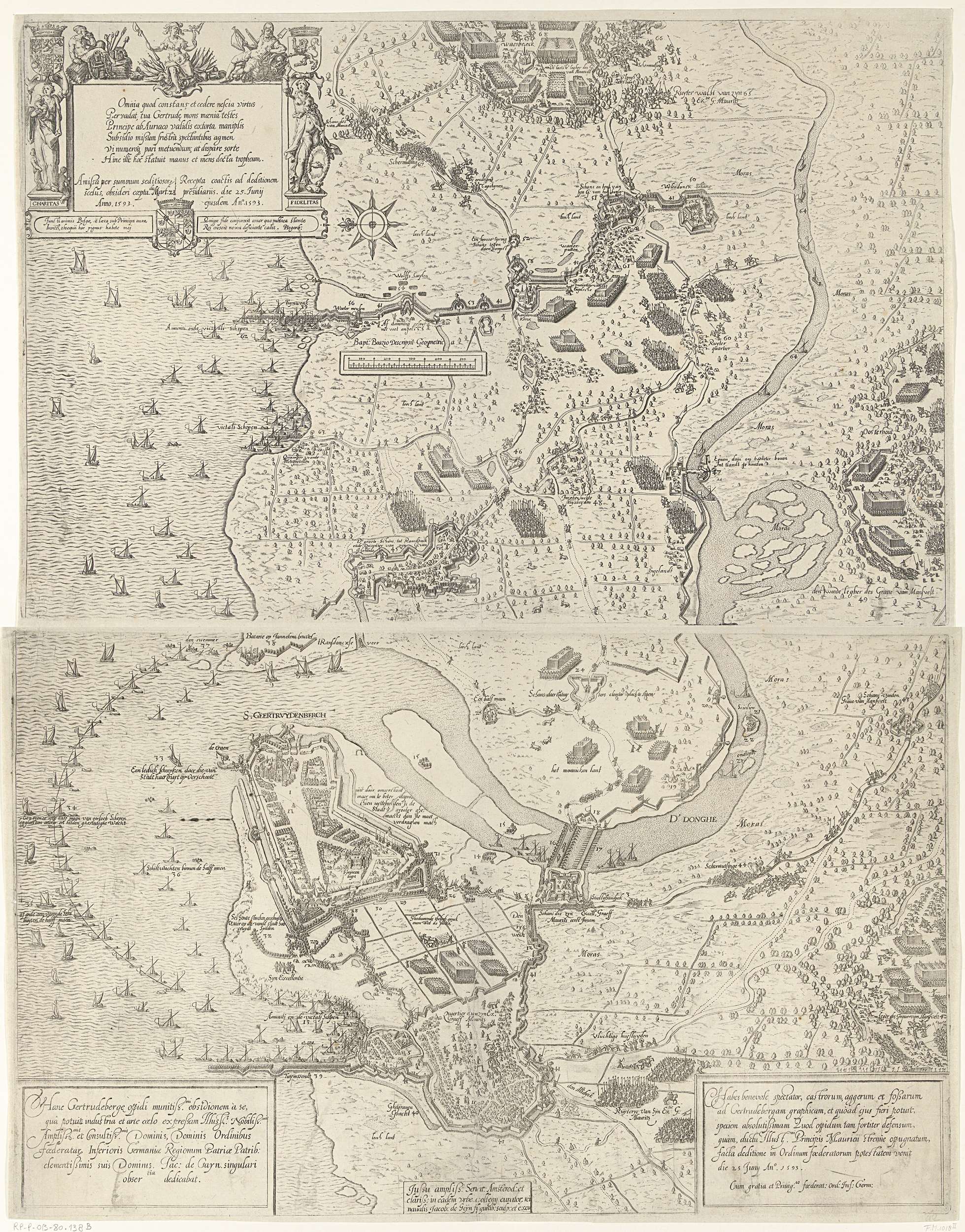 Kaart van de belegering en verovering van Geertruidenberg door het Staatse leger onder prins Maurits, 28 maart - 26 juni 1593. Geheel bestaande uit twee bladen.