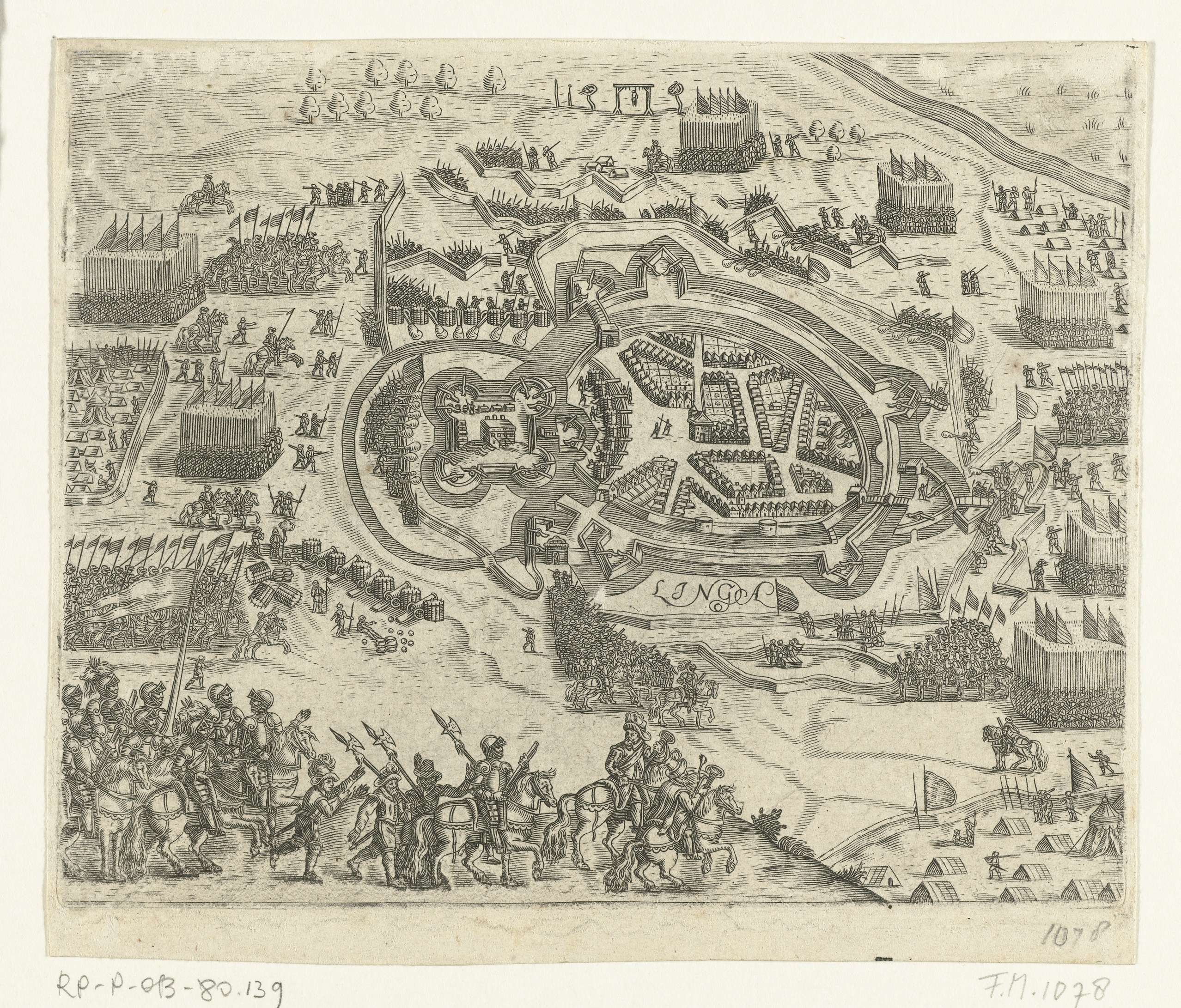 Beleg en verovering van Lingen door het Staatse leger onder prins Maurits, 12 november 1597. Plan van de stad met de posities van de belegerende troepen, op de voorgrond een stoet ruiters. Zonder het onderschrift van vier regels in het Latijn en zonder nummer. Bedrukt op de achterzijde met tekst in het Latijn.
