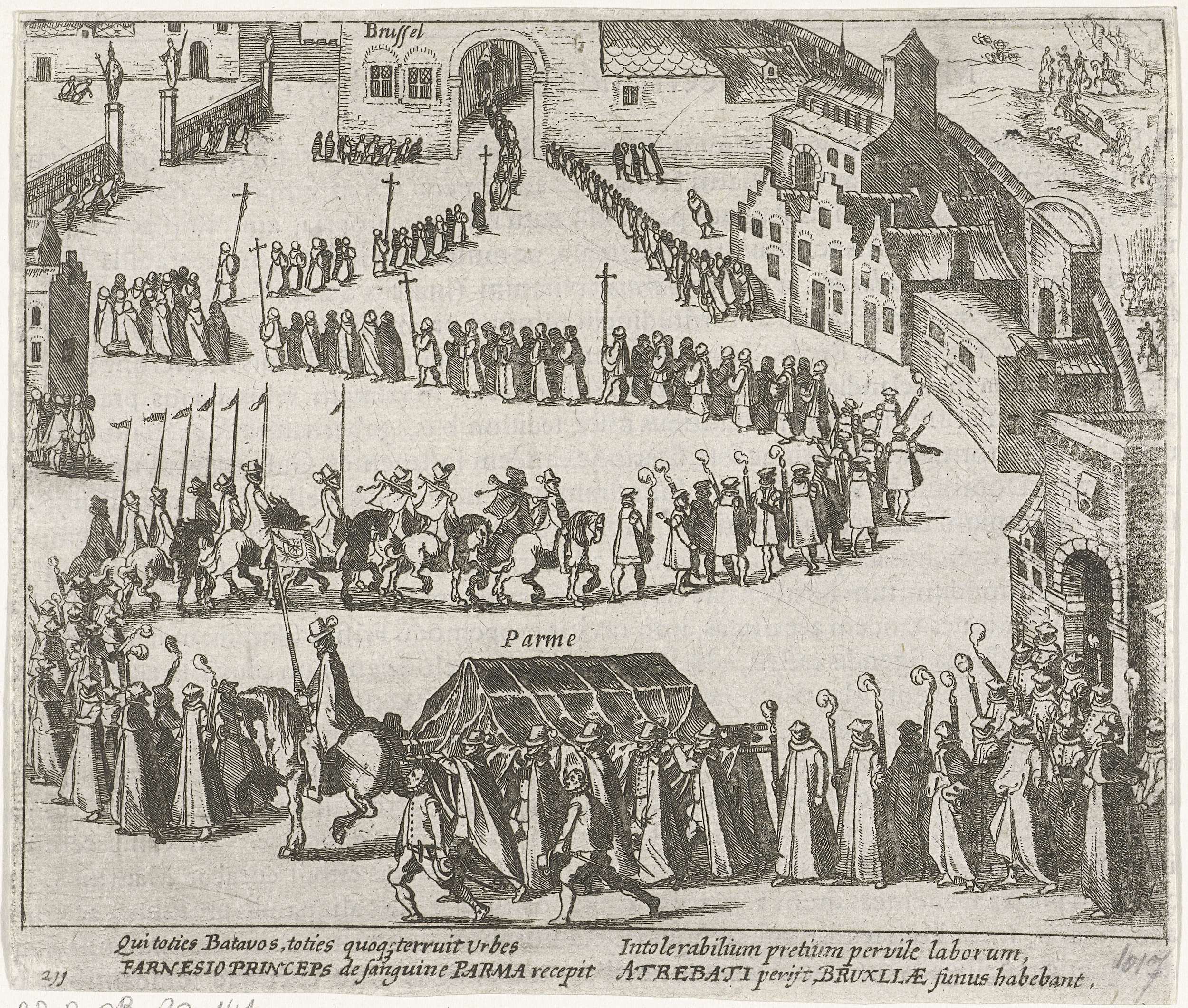 Lijkstatie voor de hertog van Parma te Brussel, 2 december 1592. Rouwstoet met lijkkist slingert door de straten van Brussel naar het paleis. Rechtsboven de aankomst van de kist met het lichaam van Parma vanuit Atrecht waar de hertog was overleden.