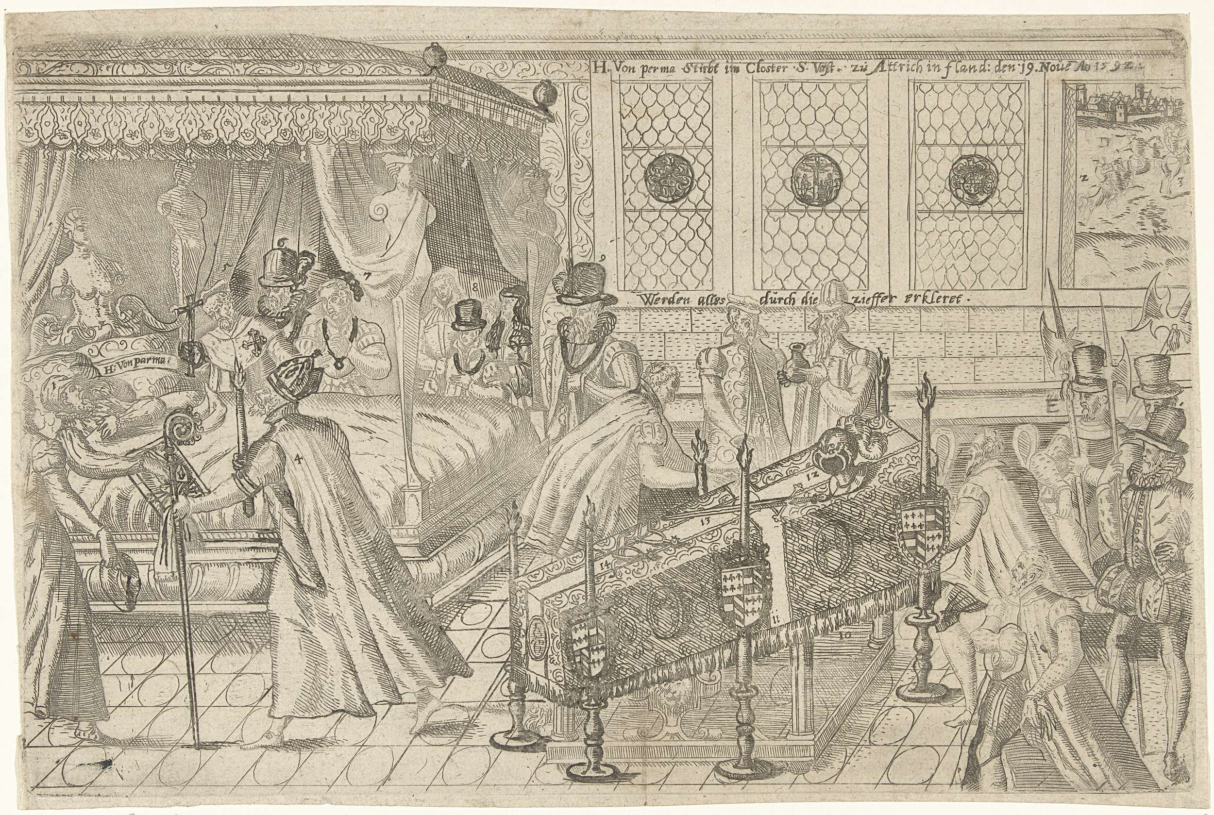 Het sterfbed van de hertog van Parma in het klooster te Atrecht waar hij overlijdt in de nacht van 2 op 3 december 1592. Links de hertog in bed met omstanders, daarnaast de gereedstaande lijkkist. Linksboven zijn door het venster enkele ruiters is te zien. Details in de voorstelling genummerd.
