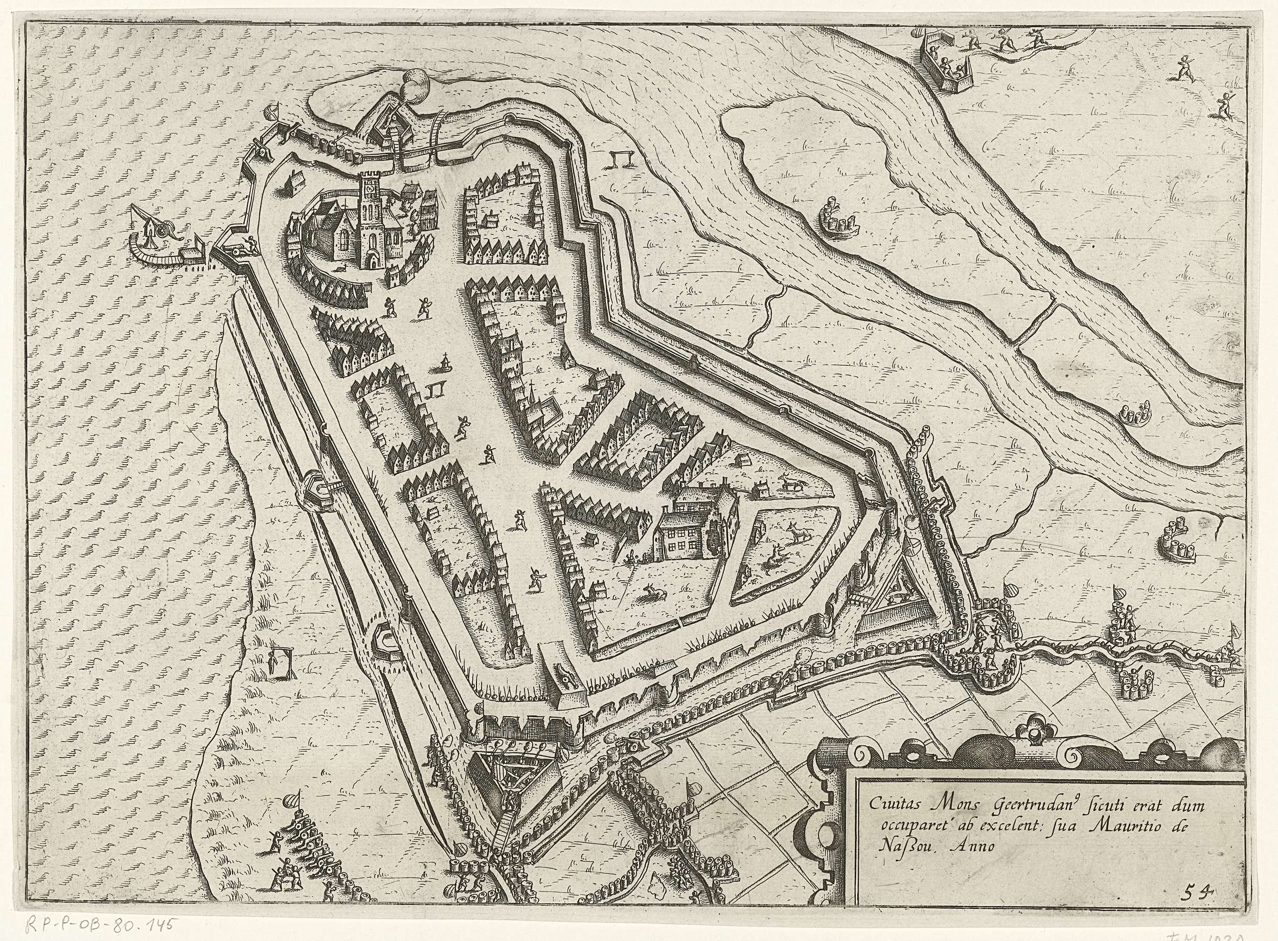 Beleg van Geertruidenberg, 28 maart - 26 juni 1593, door het Staatse leger onder prins Maurits. Kaart van de stad. Rechtsonder cartouche met cijfer 54 en de titel in het Latijn.