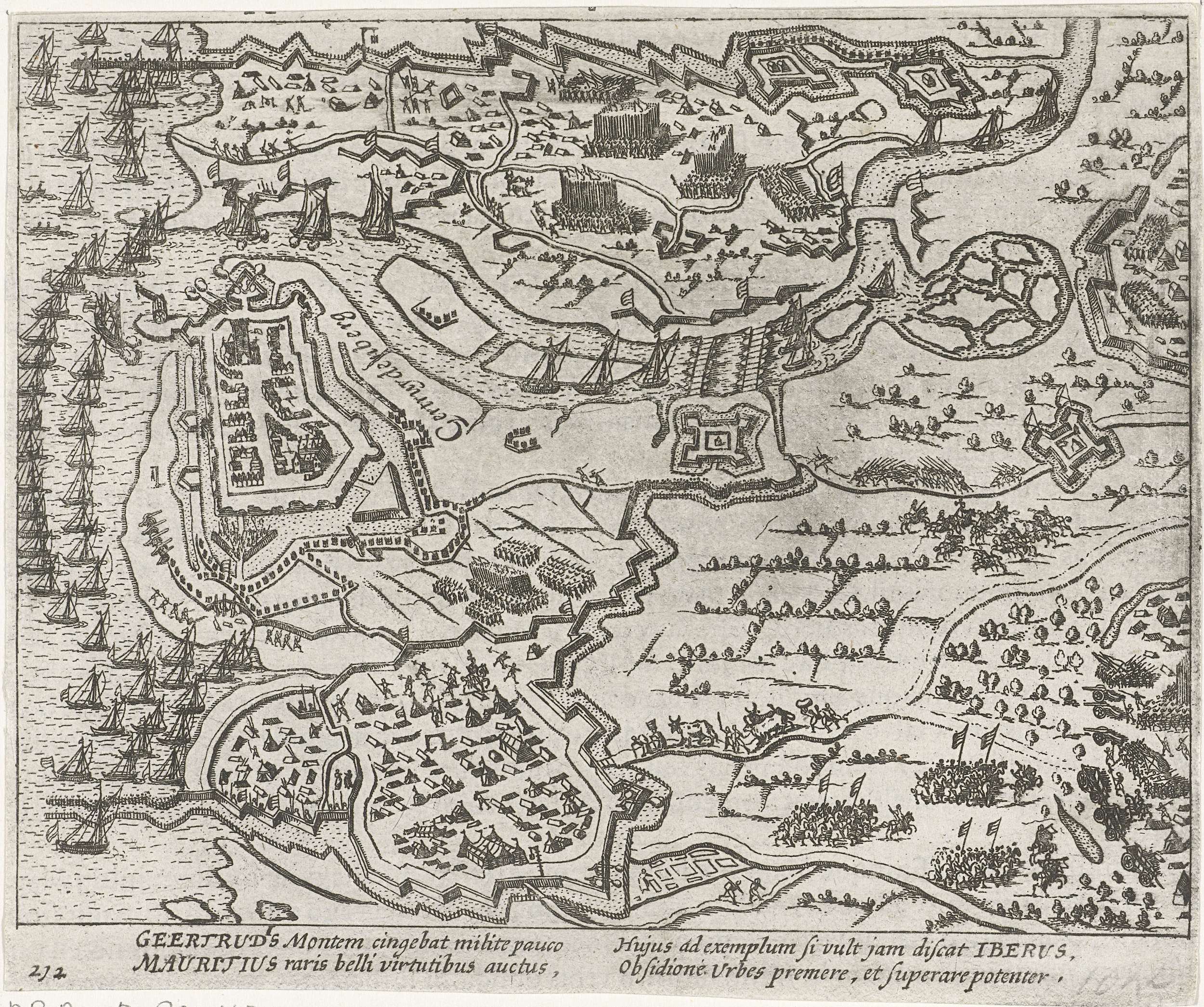 Beleg van Geertruidenberg, 28 maart - 26 juni 1593, door het Staatse leger onder prins Maurits. Plan van de stad en de nabije omgeving met de posities van de belegerende troepen en de Spaanse troepen. Links de afgesloten haven aan de Biesbos. Met onderschrift van 4 regels in het Latijn. Genummerd 212. Bedrukt op achterzijde ...