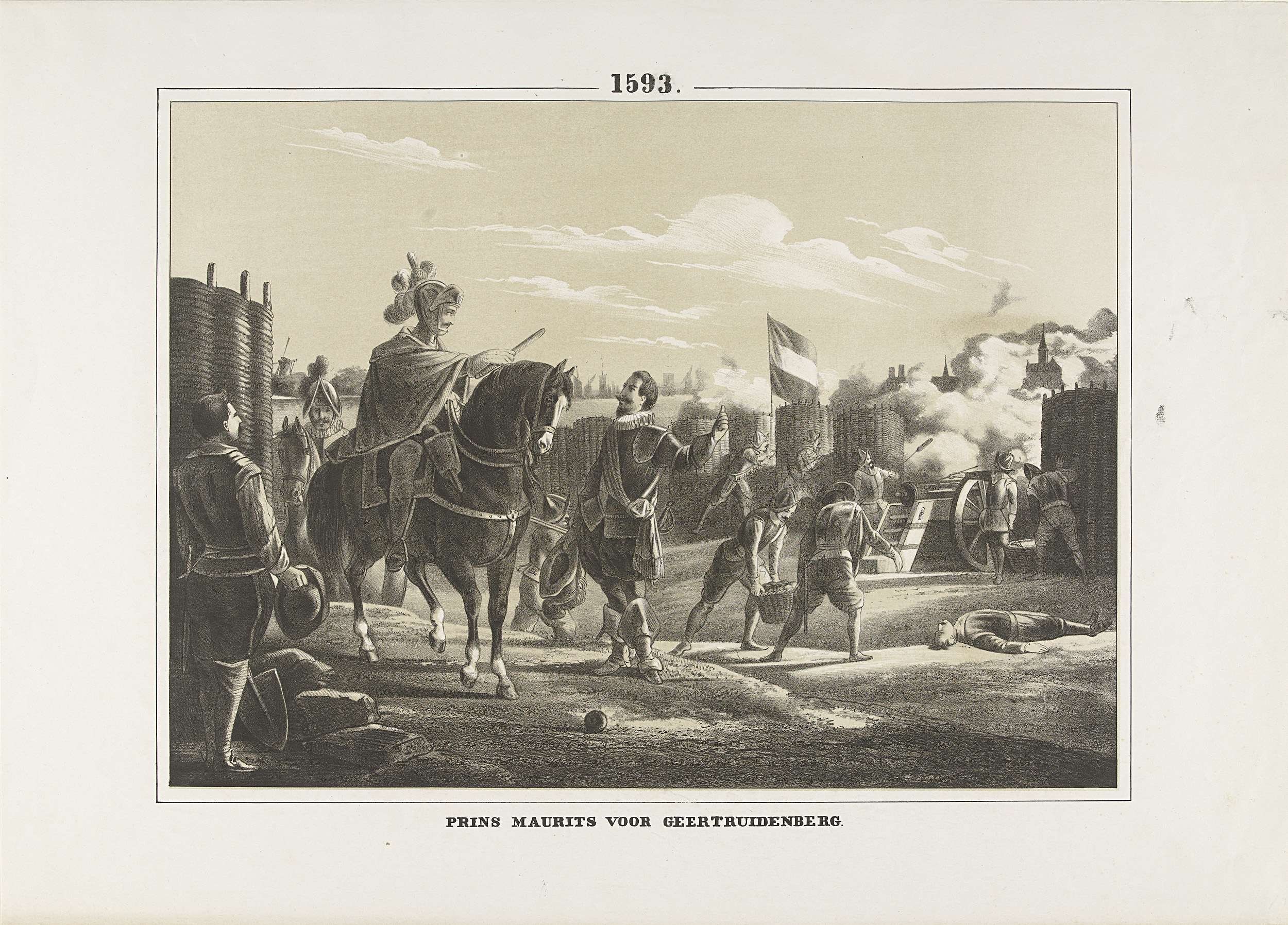 Prins Maurits te paard bij het beleg van Geertruidenberg door het Staatse leger, 28 maart - 26 juni 1593. De prins geeft aanwijzingen bij de beschietingen vanachter de schanskorven.