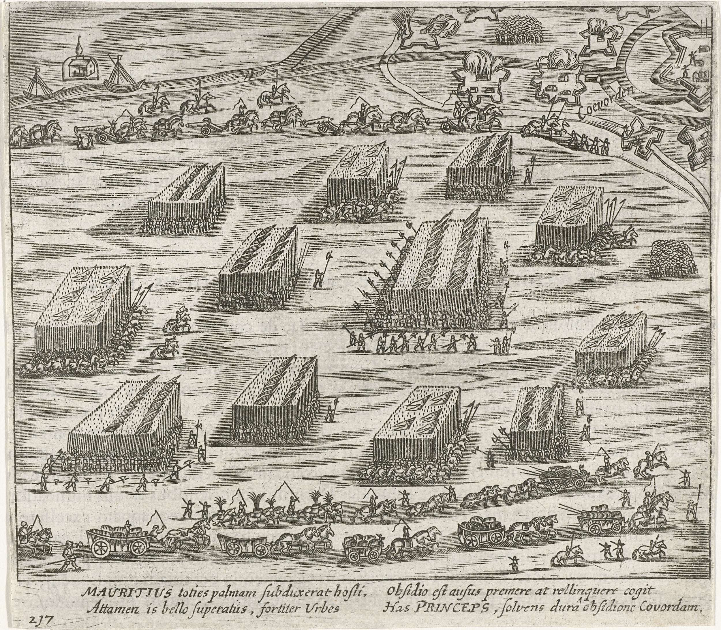 Coevorden, belegerd door Spaanse troepen onder Verdugo, wordt door het Staatse leger onder prins Maurits ontzet, 7 mei 1594. Het leger trekt in marsorde op naar Coevorden. Met onderschrift van 4 regels in het Latijn. Genummerd 217. Bedrukt op achterzijde met tekst in het Latijn.