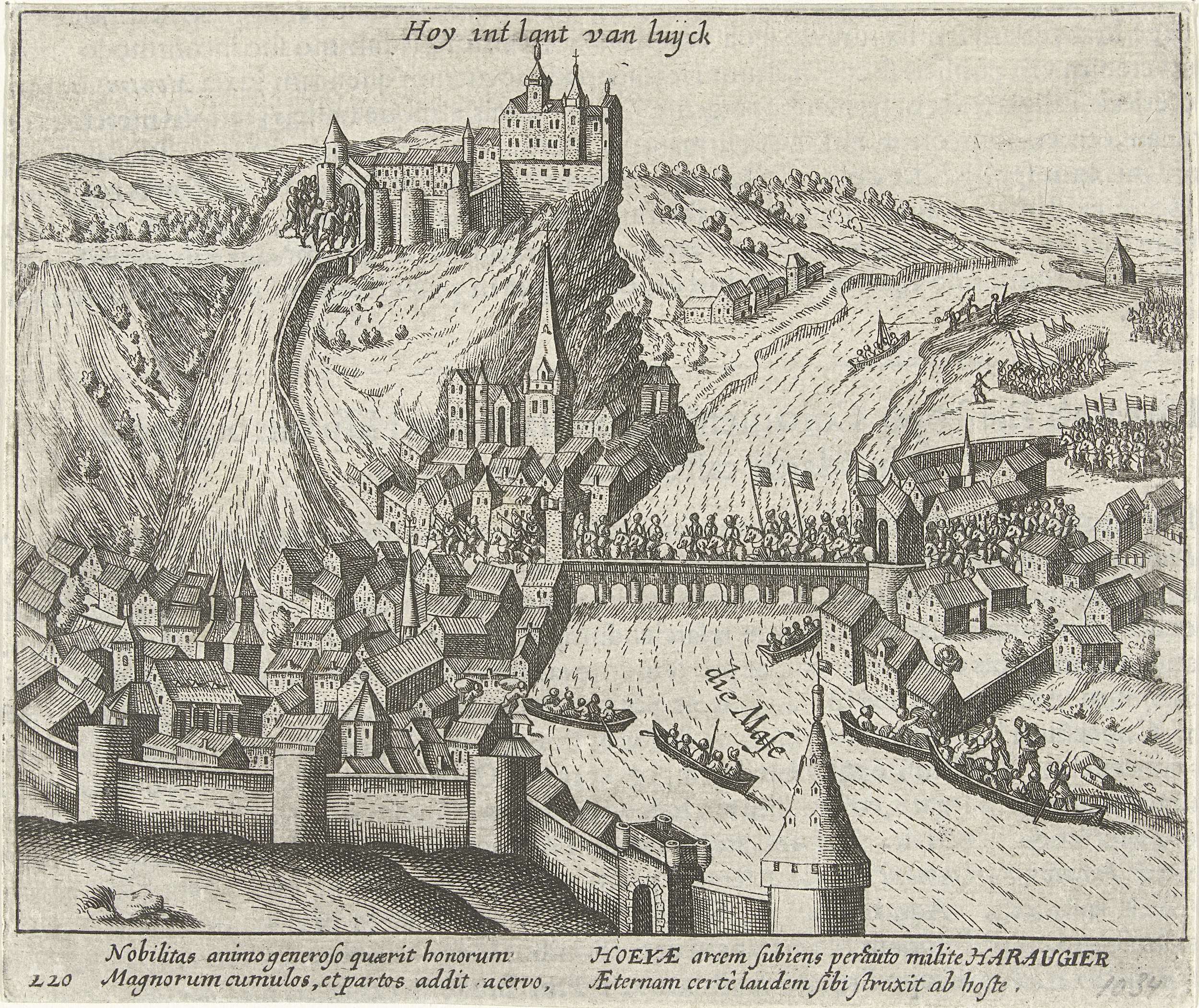 Inname van Hoei in het prinsbisdom Luik door het Staatse leger onder Heraugières, 5 februari 1595. Ruiters van het Staatse leger rijden over de brug over de Maas de stad binnen. Met onderschrift van 4 regels in het Latijn. Genummerd: 220. Bedrukt op achterzijde met tekst in het Latijn.