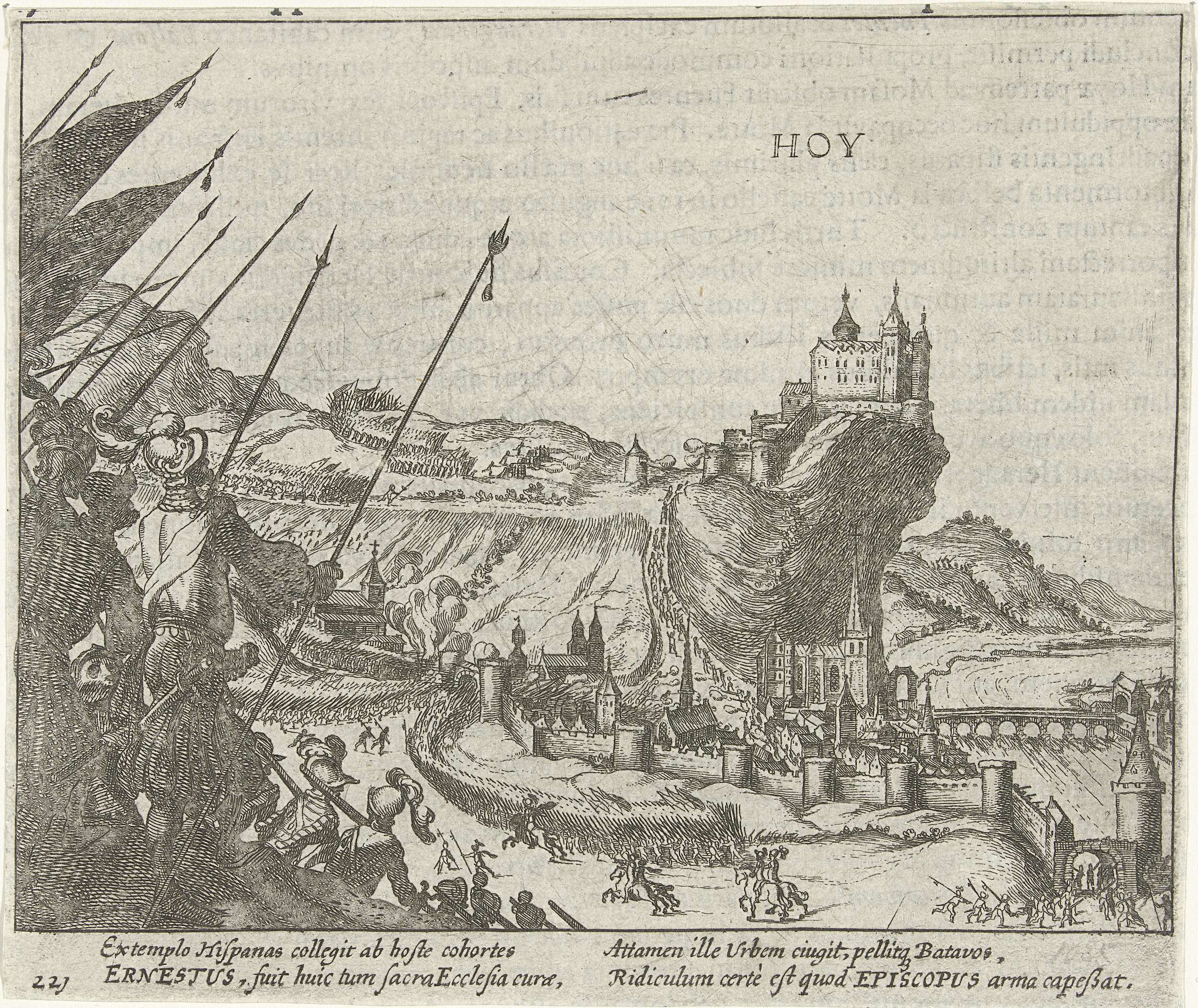 Herovering van Hoei door de bisschop van Luik op het Staatse leger, 21 maart 1595. Gezicht op de stad en het kasteel met gevechten tussen beide legers, op de voorgrond links soldaten. Met onderschrift van 4 regels in het Latijn. Genummerd: 221. Bedrukt op achterzijde met tekst in het Latijn.