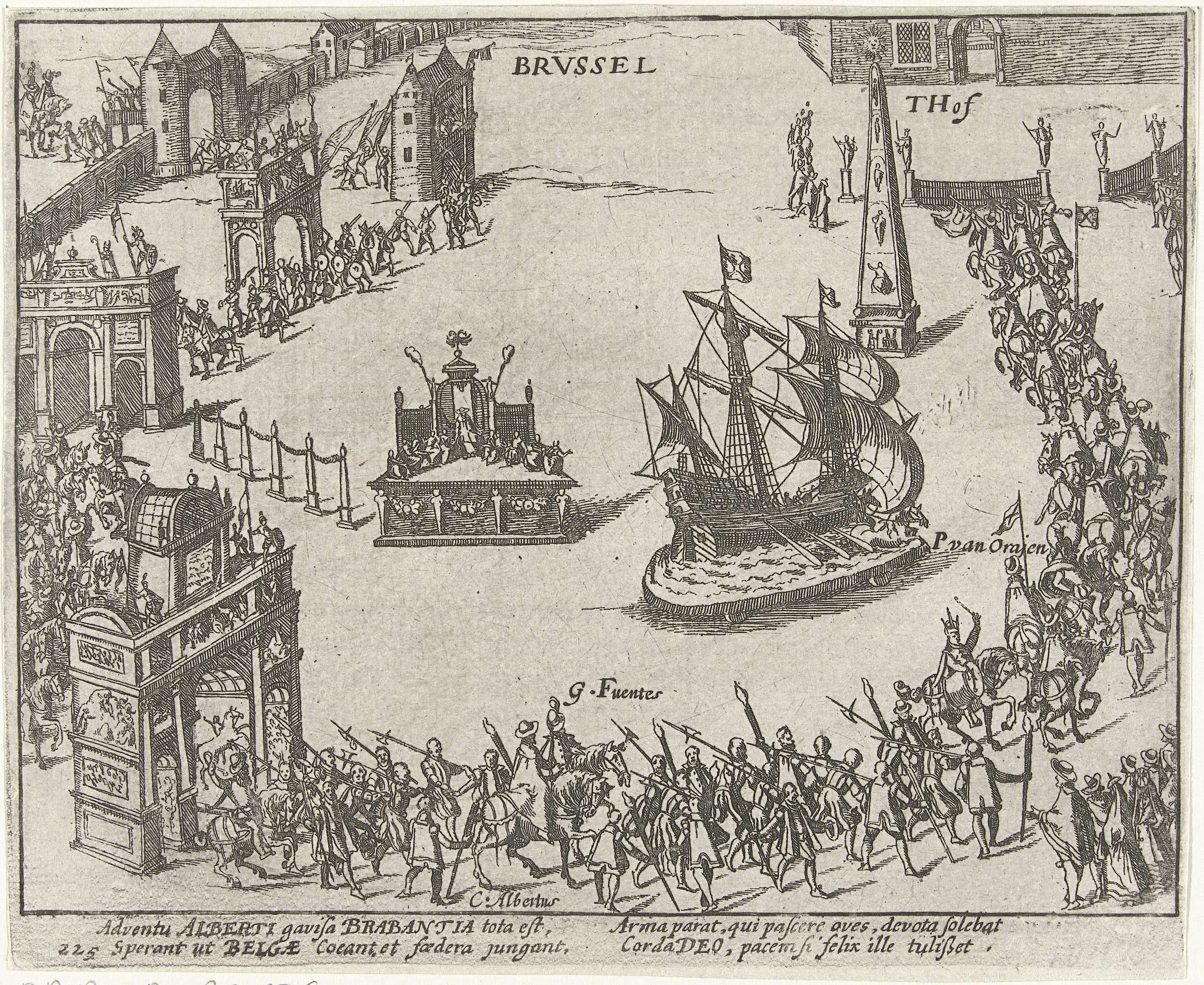 Intocht van aartshertog Albrecht van Oostenrijk als nieuwe landvoogd te Brussel, 11 februari 1596. De stoet met Albrecht, de graaf van Fuentes en prins Filips Willem trekt door triomfpoorten en langs tonelen en een praalwagen met een schip naar het Paleis. Met onderschrift van 4 regels in het Latijn. Genummerd: 225. Bedrukt op achterzijde met ...