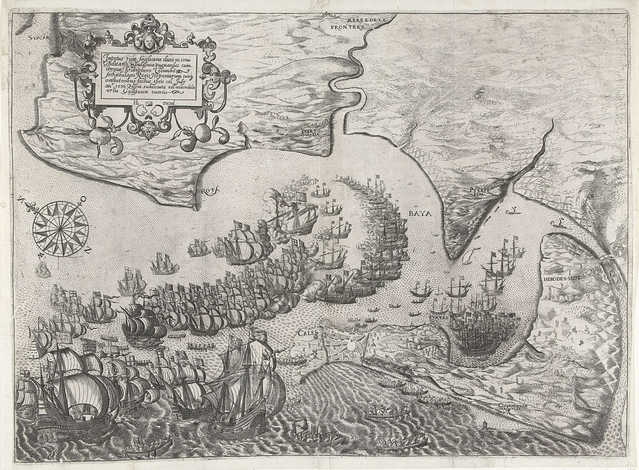 Nederlaag van de Spaanse vloot toegebracht door de Engelse en Nederlandse vloten bij Cadiz, 1 juli 1596. Plan van de baai met midden onder de stad Cadiz gelegen op het Spaanse schiereiland. Linksboven een cartouche met opschrift in het Latijn.