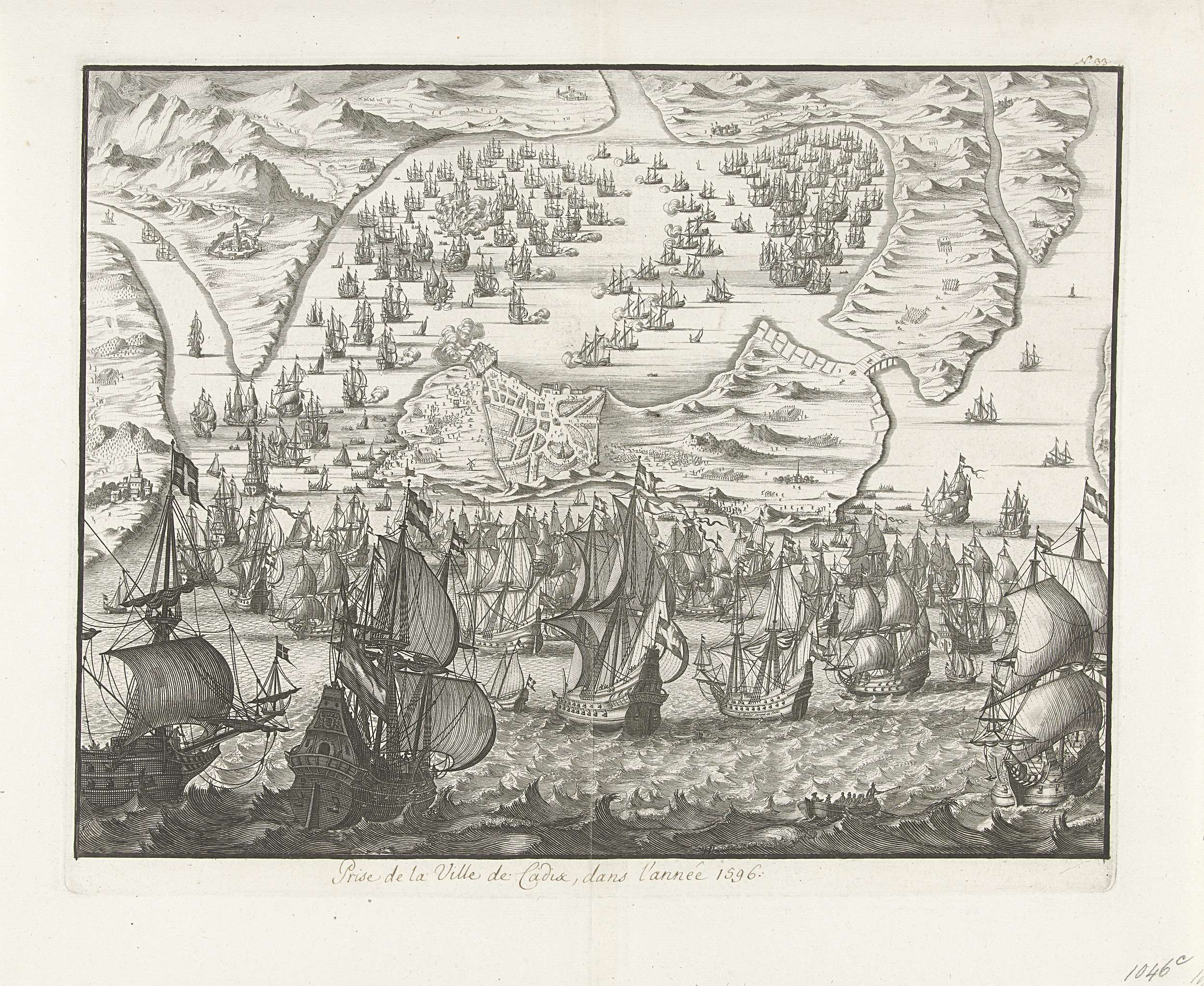 Nederlaag van de Spaanse vloot toegebracht door de Engelse en Nederlandse vloten bij Cadiz, 1 juli 1596. Plan van de baai met in het midden de stad Cadiz gelegen op het Spaanse schiereiland. Op de voorgrond de zeeslag.