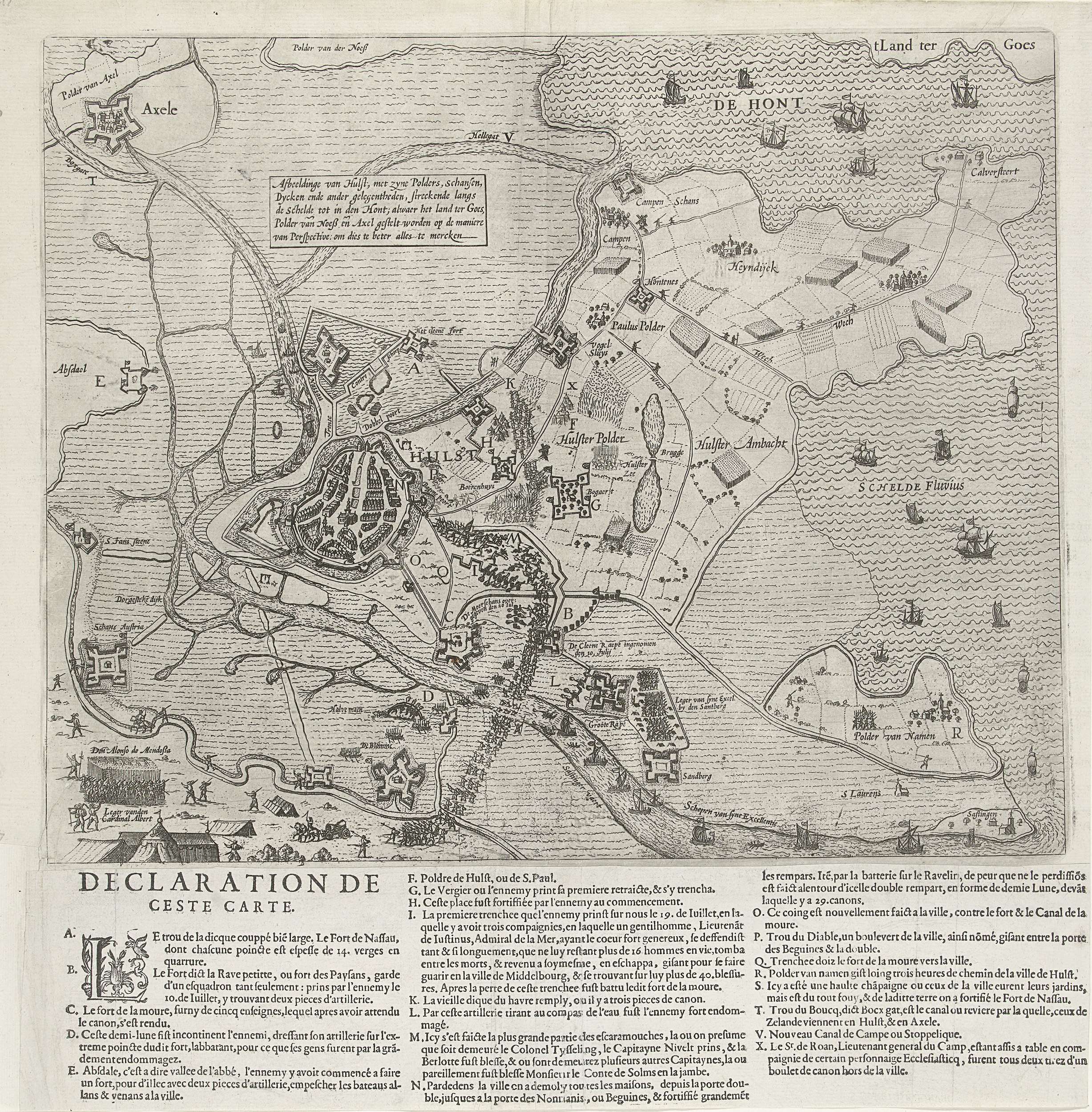 Beleg van Hulst door het Spaanse leger onder aartshertog Albrecht van Oostenrijk, 8 - 21 juli 1596. Plan van Hulst met de schansen in de omgeving, linksboven Axel, rechts de Schelde. Alle opschriften in de plaat in het Nederlands. Onder de prent geplakt een verklaring van de voorstelling met de legenda A-X in het Frans, ...