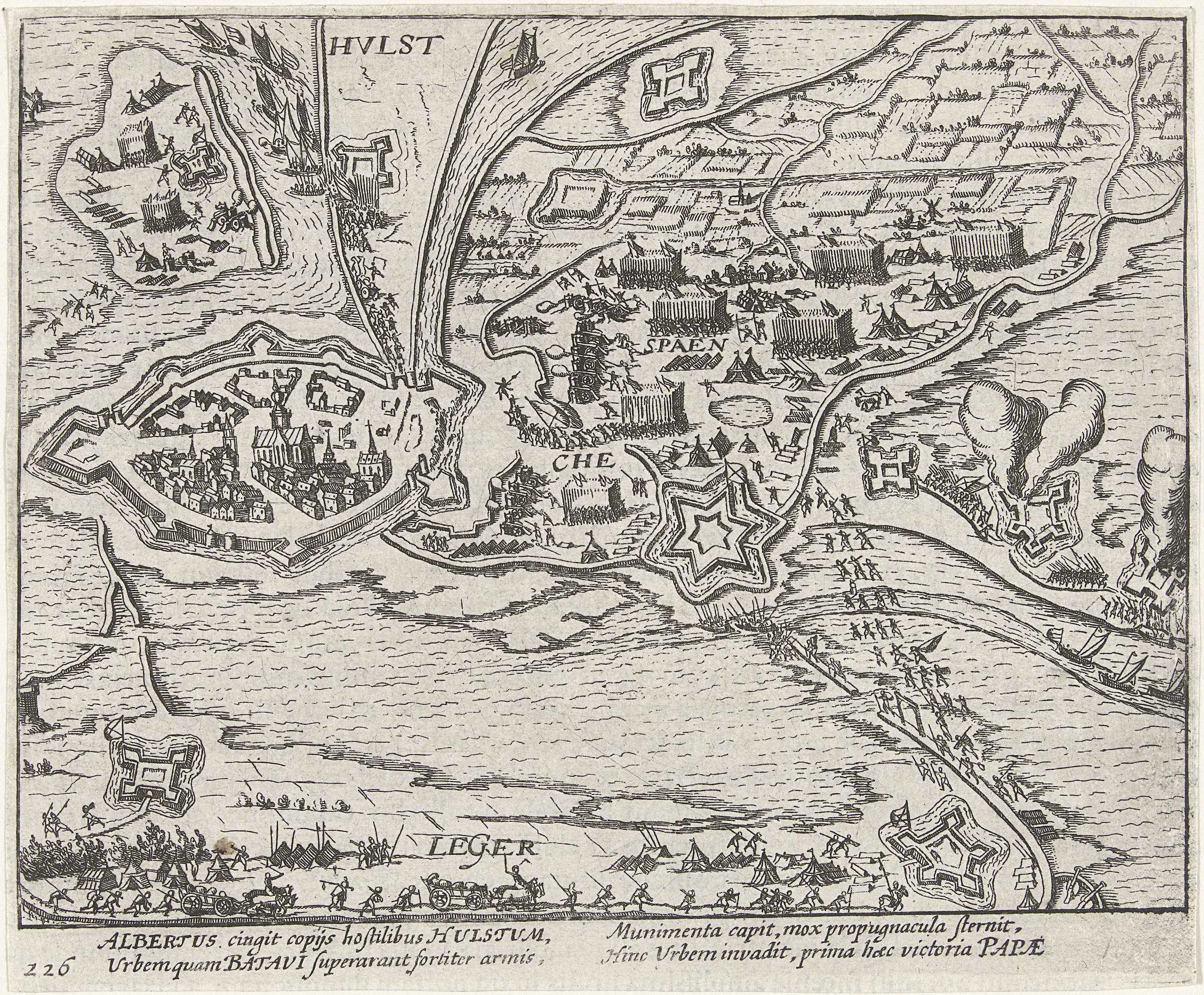Beleg van Hulst door het Spaanse leger onder aartshertog Albrecht van Oostenrijk, fase 8 juli - 18 augustus 1596. Plan van Hulst met omringende schansen, polders en verdronken land. Onderaan het Spaanse kamp van waaruit de vaart is overgestoken om schansen in handen van het Staatse leger aan te vallen. Met onderschrift van 4 regels ...