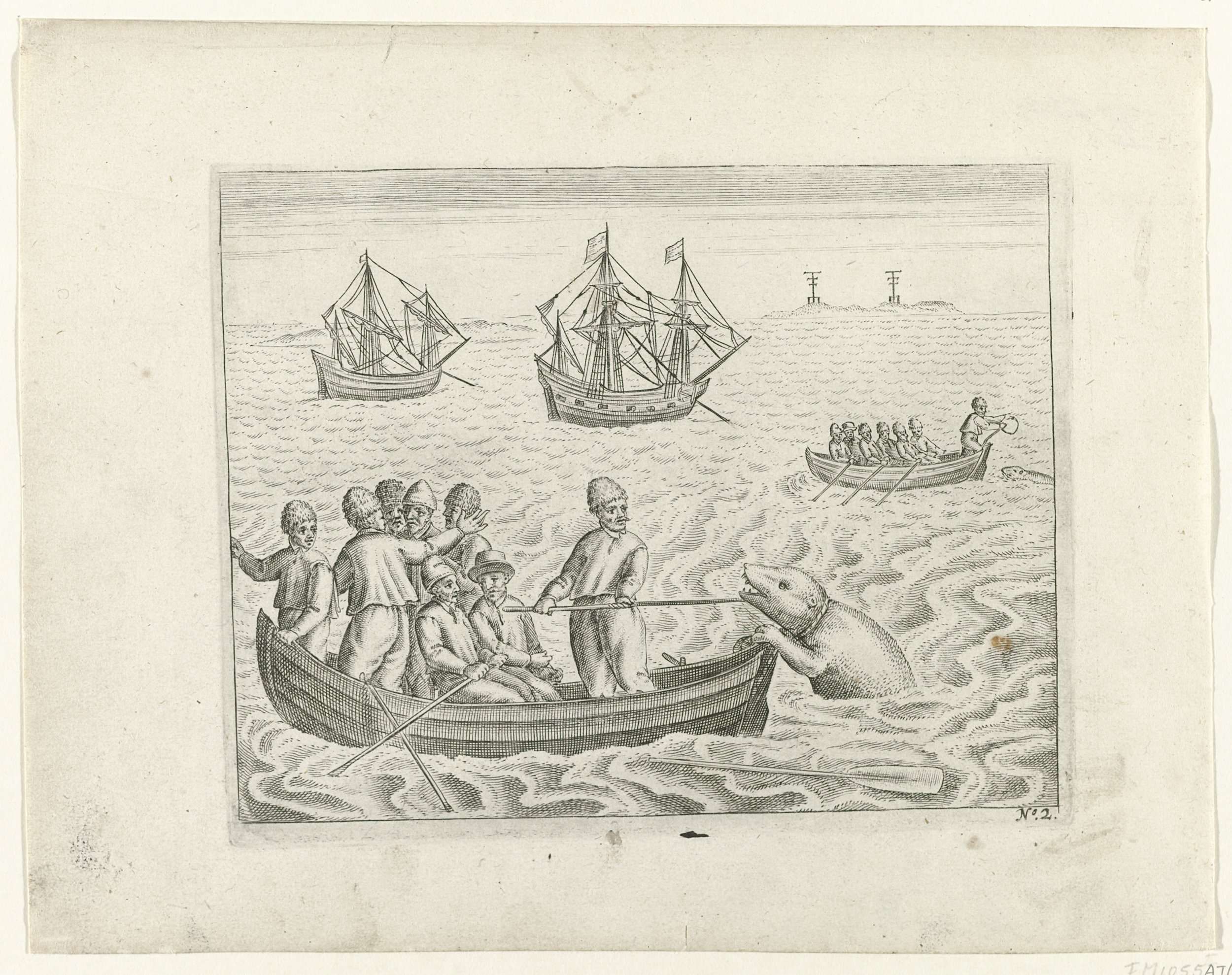 Pogingen om een ijsbeer te vangen en de aanval van de gevangen ijsbeer op de sloep met Barendsz tijdens de eerste reis, 19 juli 1594. Kopieën naar de oorspronkelijke illustraties in het reisverslag van de tocht van Willem Barendsz en Jacob van Heemskerck in 1596-1597 en het verblijf op het eiland Nova Zembla, No. 2.