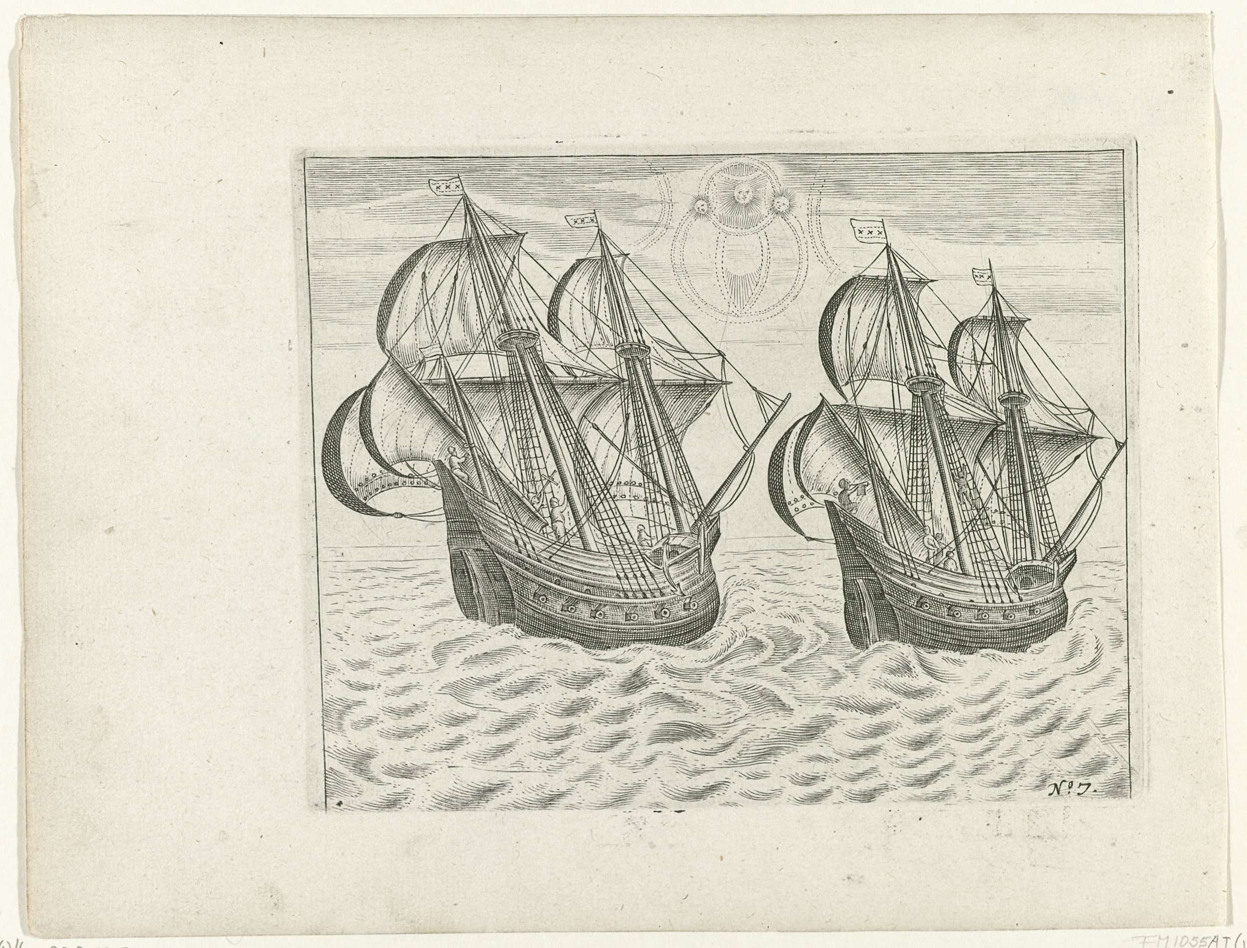 De twee schepen van Barendsz en Van Heemskerck en een hemelverschijnsel, 4 juni 1596. Kopieën naar de oorspronkelijke illustraties in het reisverslag van de tocht van Willem Barendsz en Jacob van Heemskerck in 1596-1597 en het verblijf op het eiland Nova Zembla, No. 7.